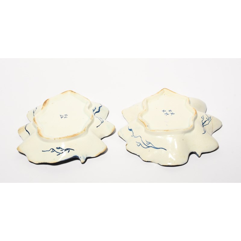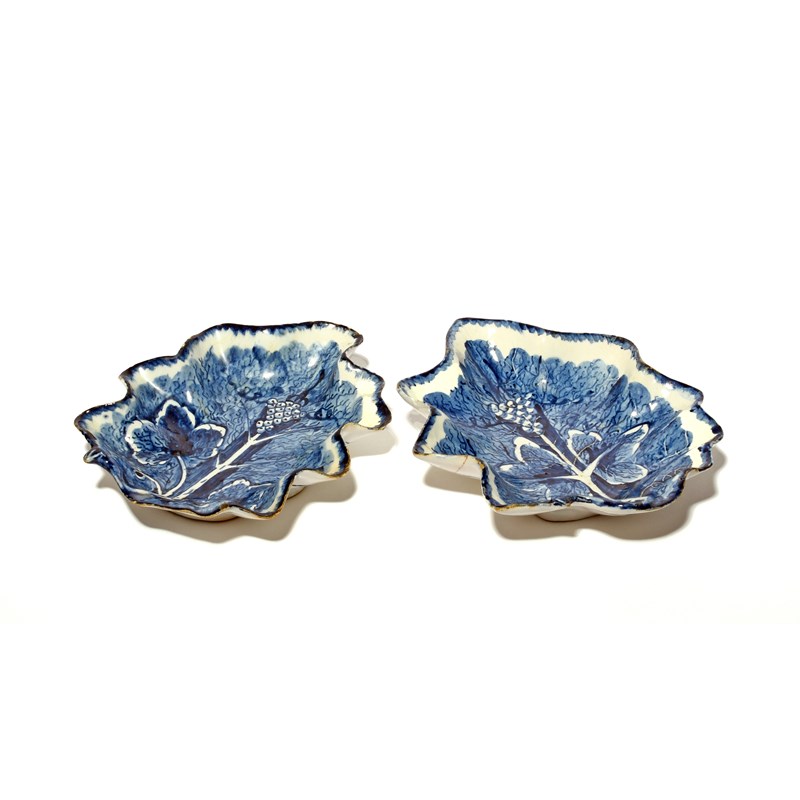 A pair of Bow blue and white leaf dishes, c.1765, each modelled as a large vine leaf, painted with