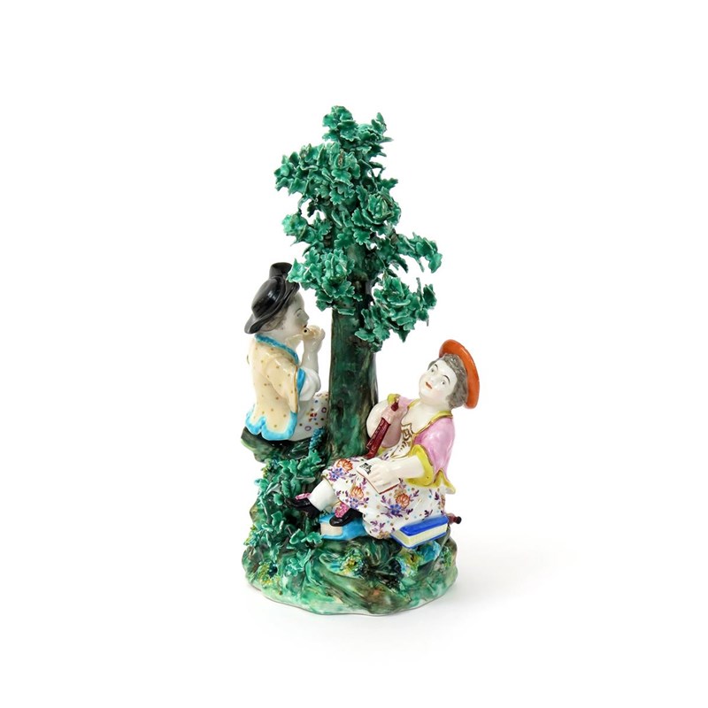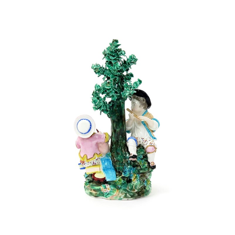 A Derby figure group of Music c.1775-80, of two children seated around a tree, he playing the flute, she with the bagpipes and holding a musical score on her knee, raised on a rocky base, incised No.139 to the base, minor losses, 23.2cm.