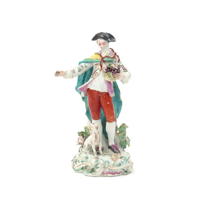 A Chelsea figure of a gardener c.1760-65, standing with a satchel slung over his shoulder, holding a basket of fruit in his left hand and extending a single fruit in his right, his dog seated beside him, raised on a low scrolled base applied with flowers, gold anchor mark, a small amount of good restoration, 23.2cm.