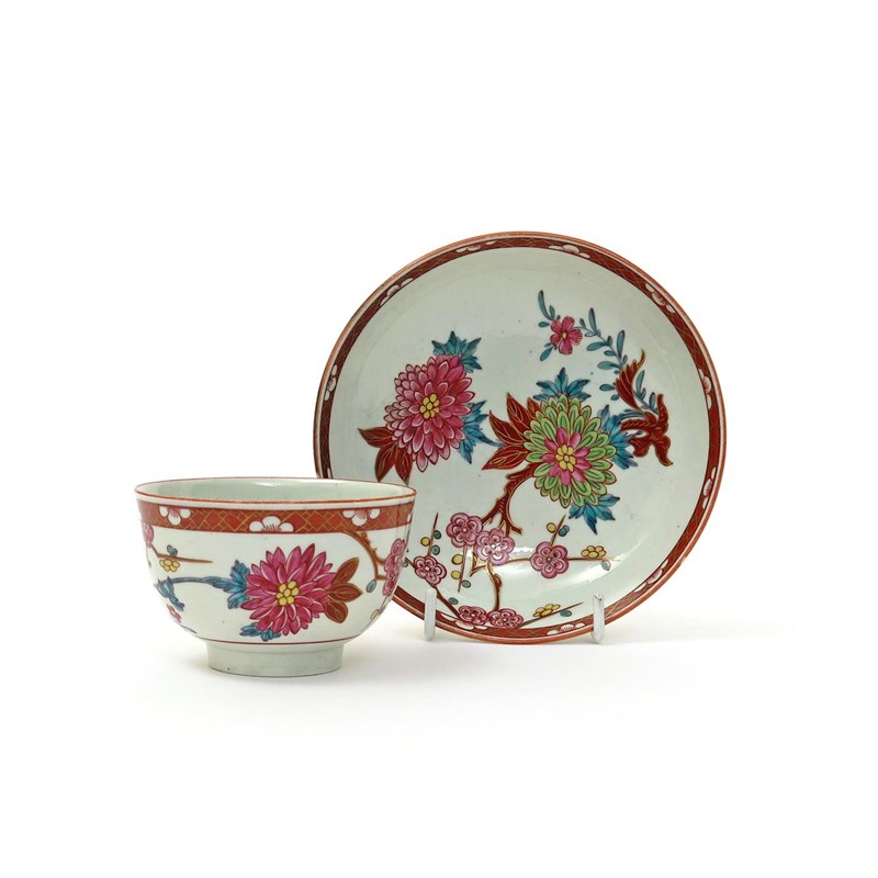 A rare Worcester teabowl and saucer c.1760-70, enamelled in a dark famille rose palette with chrysanthemum and peony sprays within an orange-red band of half flowerheads and gilt geometric design, 12.7cm. (2)