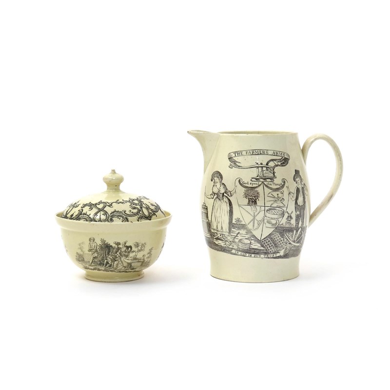 A creamware sucrier and cover c.1760-70, printed in Liverpool by John Sadler with Pierrot creeping up on Harlequin and Columbine, the reverse with sheep grazing, the cover with a continuous scrolling foliate design, and a creamware jug printed in black with The Farmers Arms, the reverse with a print of a twelve line poem within a cartouche of farming attributes, signed and dated TW 1760 in the print, 12.8cm max. (3)
