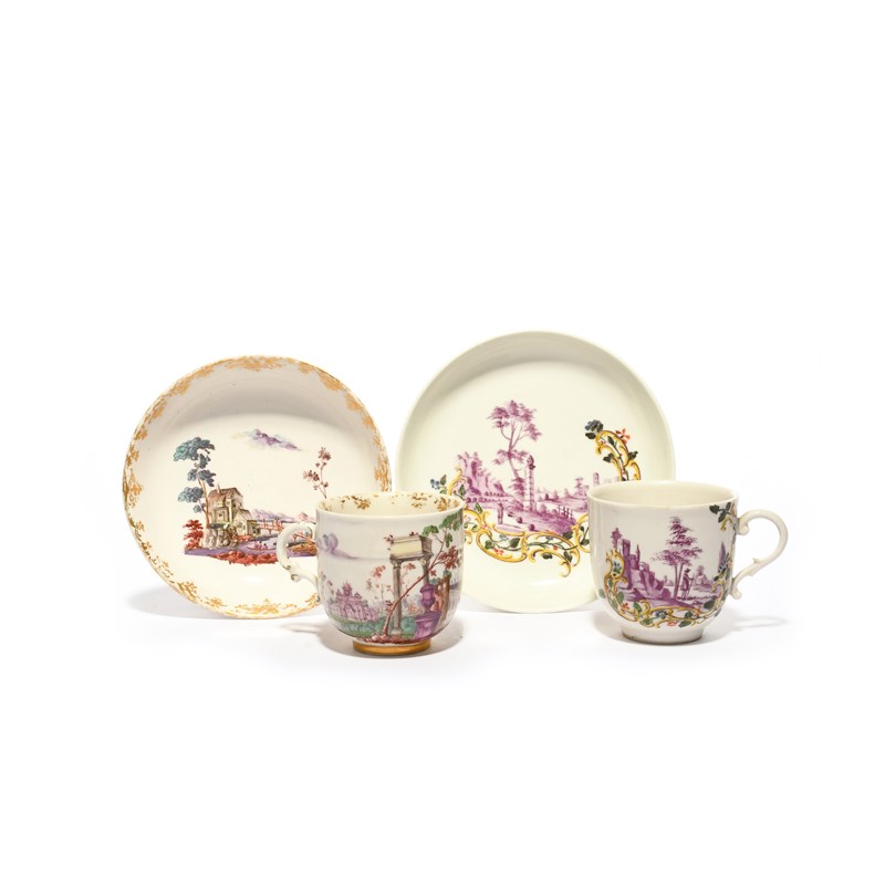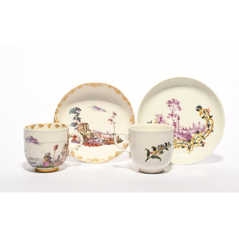 A rare Nymphenburg coffee cup and saucer, dated 1757, the cup painted with three figures beneath a banner inscribed with an AR monogram and the date 1757, beside a small church, the saucer with further figures beside a bridge over water, and another Nymphenburg cup and saucer painted in purple monochrome with travellers in waterside landscapes, with rococo trellis work in yellow, green and red, impressed shield marks, some gilt wear, restoration to one handle, 14cm max. (4)