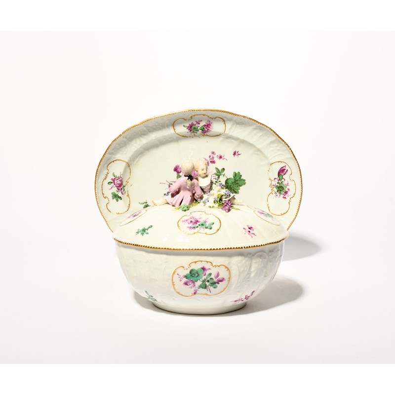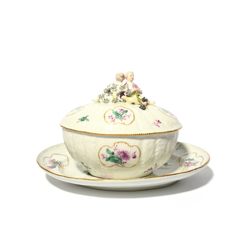 A Meissen oval tureen with cover and stand, mid 18th century, moulded with rococo floral panels, painted in puce and green with flower arrangements and scattered sprigs, the cover's finial formed as two children with fruiting grapevine, blue crossed swords marks, the stand with an impressed H, 29.2cm. (3)