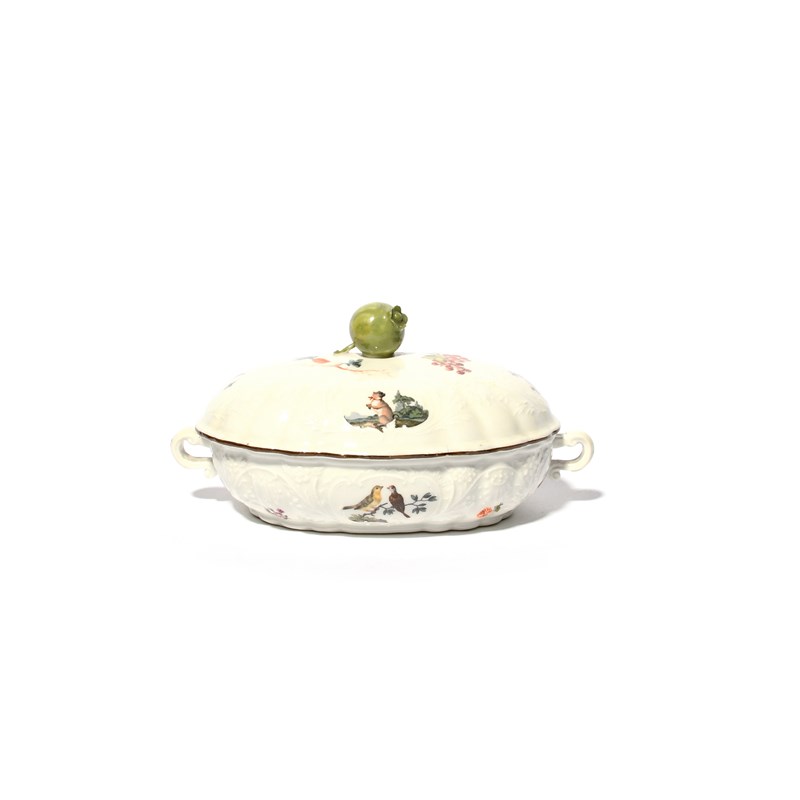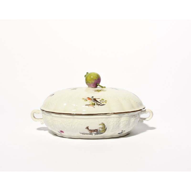 A small Meissen oval tureen or sugar box and cover, mid 18th century, moulded with rococo panels and painted with small vignettes of birds, animals, flowers and fruit, the cover with a pomegranate finial, blue crossed swords mark, 16.5cm across. (2)