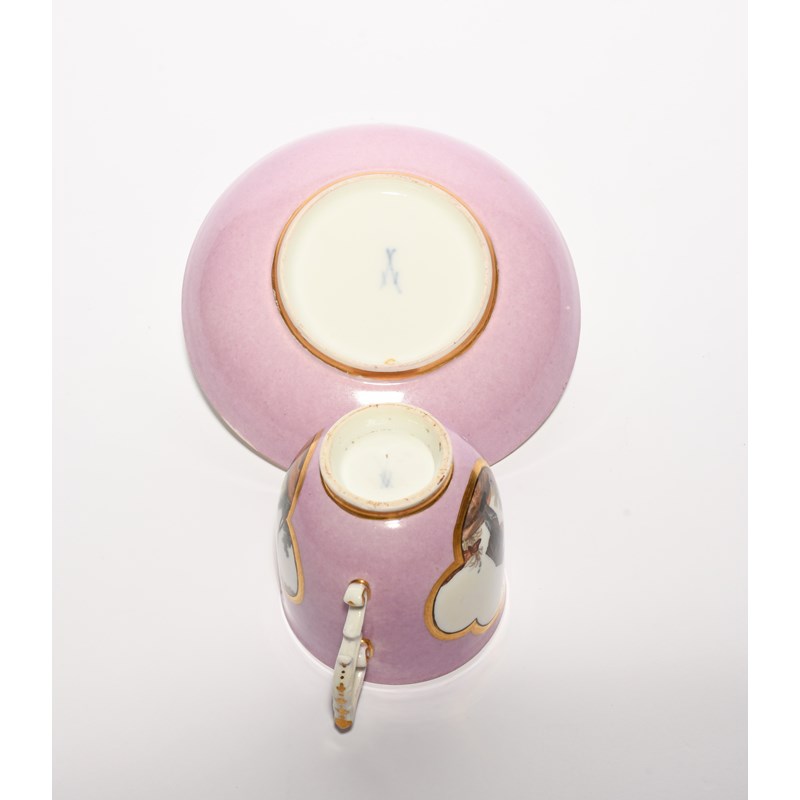 A Meissen coffee cup and saucer, c.1745, the cup painted with quatrefoil panels of peasants, including a traveller in a black cloak watched by a girl in a window, reserved on a powdered purple ground, the saucer paintyed with two peasants beneath a tree, the underside with the same powdered ground, blue crossed swords and gilt G marks, 13.2cm. (2)