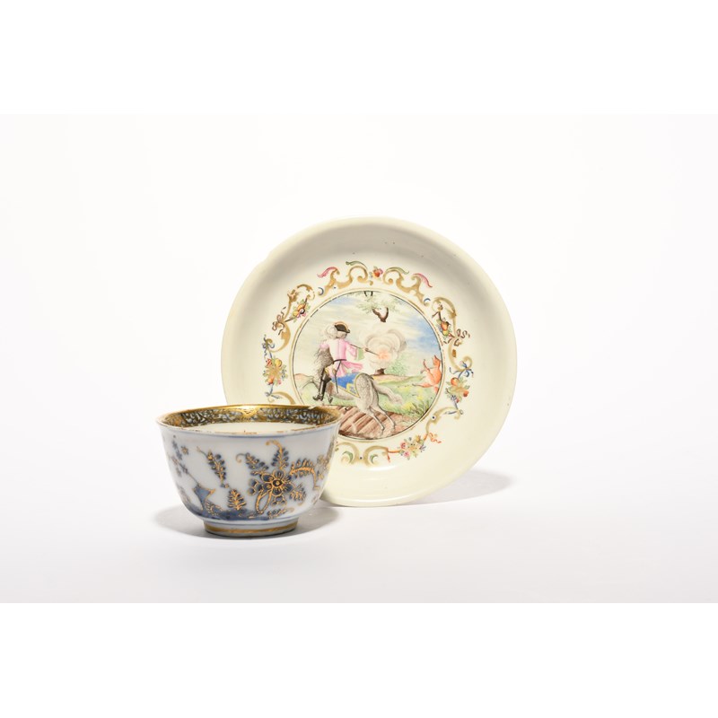 A Meissen hausmaler-decorated saucer and a teabowl, c.1730, the teabowl originally decorated in the Fels und Vogel pattern, embellished with gilding and enamels in the workshop of F J Ferner with a gentleman seated on rocks between palm trees, with buildings and a rose spray, the saucer possibly decorated in Bayreuth with a hunter on horseback shooting a fox, within a circular border of fruit, flowers and ribbon scrolls, the underside sprigged with prunus and brightly enamelled, blue crossed swords mark to the teabowl, small rim nibbles, 13cm max. (2)