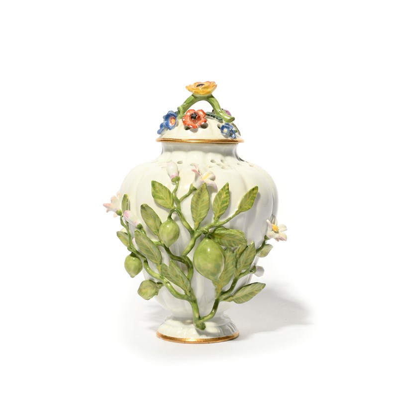 A Meissen pot pourri vase and cover, mid 18th century, the fluted form applied with fruiting branches of lime, the cover applied with flowers, blue crossed swords mark, small losses, 19cm. (2)