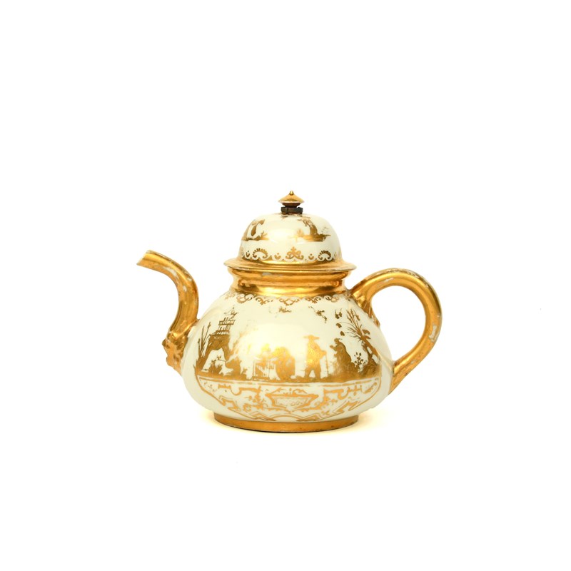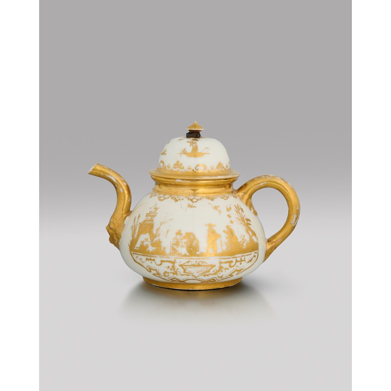 A Meissen hausmaler goldchinesen teapot, c.1720-25, decorated in Augsburg or Dresden with gilded Chinese figures at various pursuits in garden settings, between strapwork borders, the gilt spout issuing from a mask head, some gilt wear, two small chips to the cover, 16.2cm across. (2)