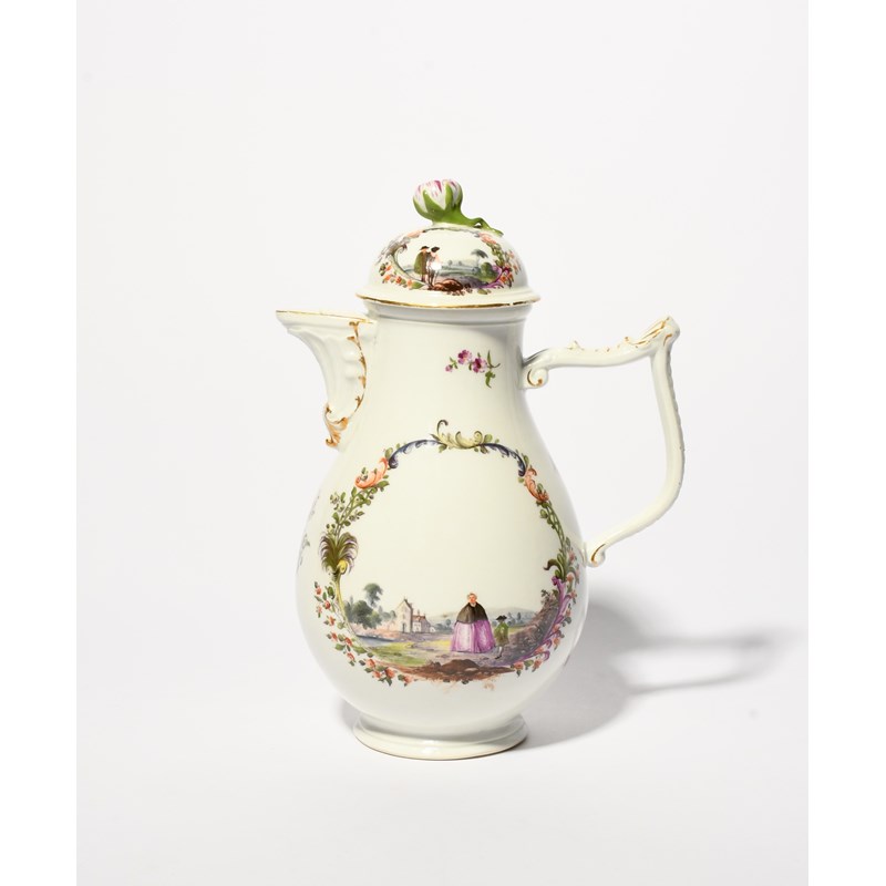 A Meissen coffee pot and cover, mid 18th century, the baluster form painted to one side with a large woman in a cloak standing before a small man, the reverse with figures beside buildings, within borders of flowers and leaf scrolls, the cover with similar panels, with a moulded wishbone handle, blue crossed swords mark, incised letter to the footrim, 23cm. (2)