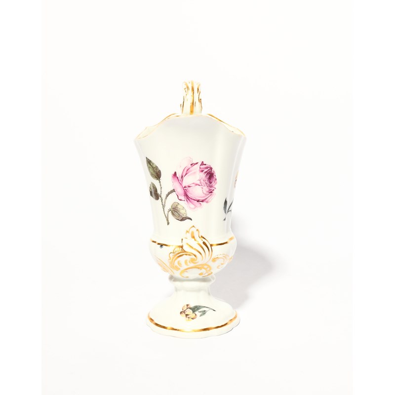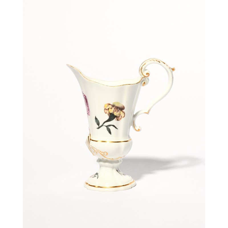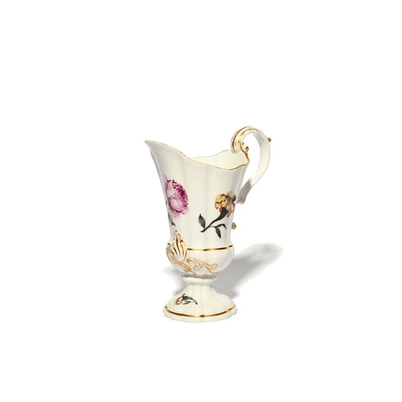 A Meissen helmet ewer, c.1740, finely painted with Holzschnitt Blumen, including a rose and narcissus, raised on a spreading foot and applied with a scroll handle with gilt detailing, blue crossed swords mark, a section broken and restuck by the handle, 16.8cm.