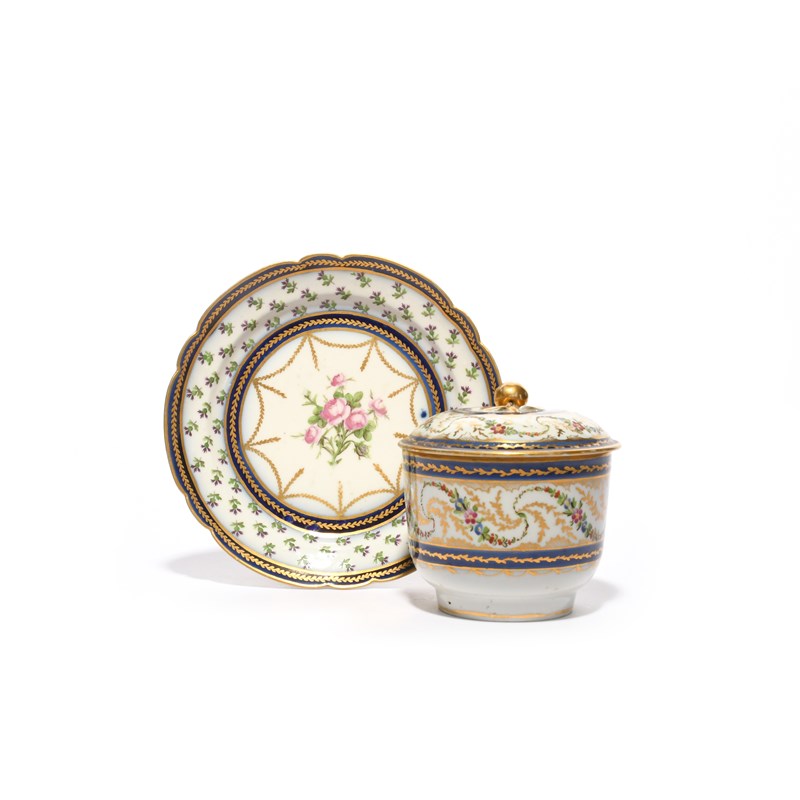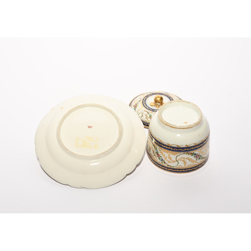 A Wallendorf sucrier and cover, c.1765, of U-shape, decorated in the Sèvres manner with continuous flower garlands between blue and gilt foliate bands, gilt W mark, and a small plate or stand painted with pink roses within gilt husk swags and a repeated cornflower band, red W mark, 17.6cm max. (3)