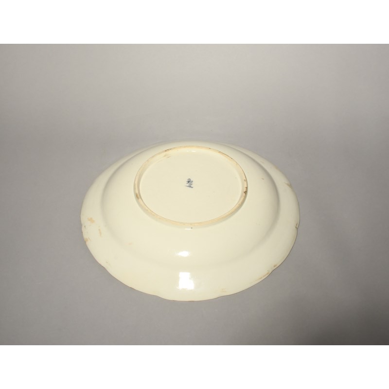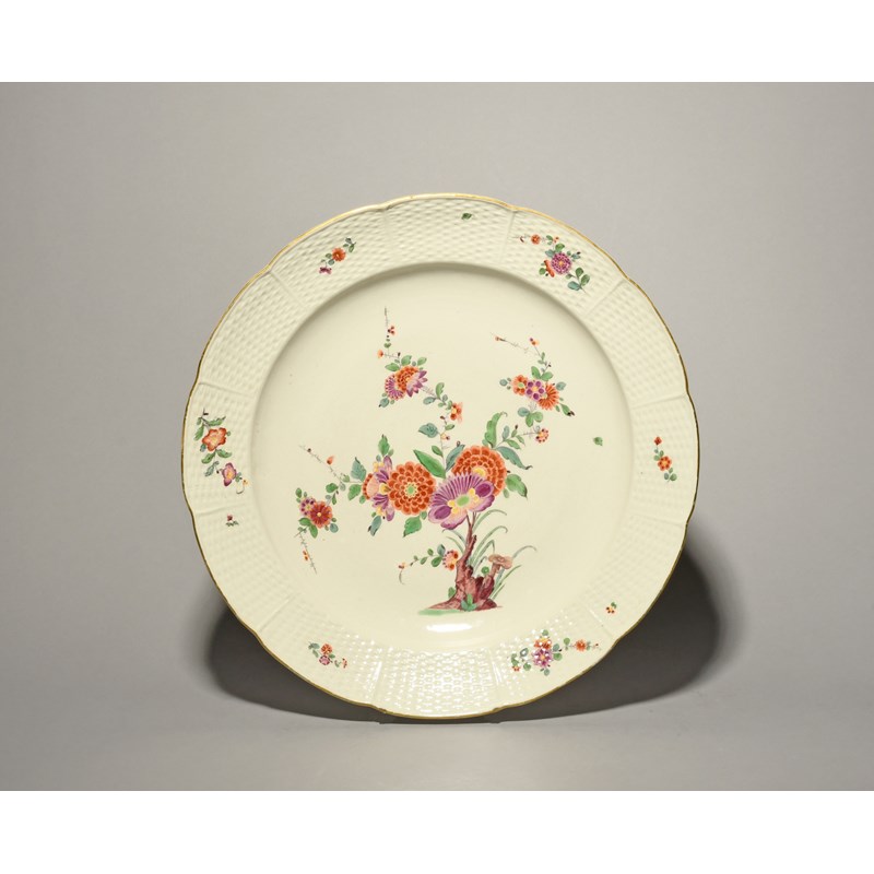 A massive Frankenthal dish or charger, c.1760, painted in the manner of A F Löwenfinck with flowering branches in an extended Kakiemon palette, the rim with basketweave moulding and small scattered sprigs, blue lion rampant mark, 39.5cm.