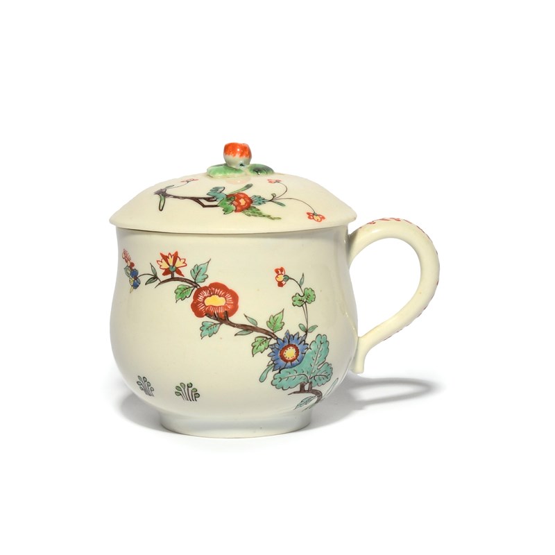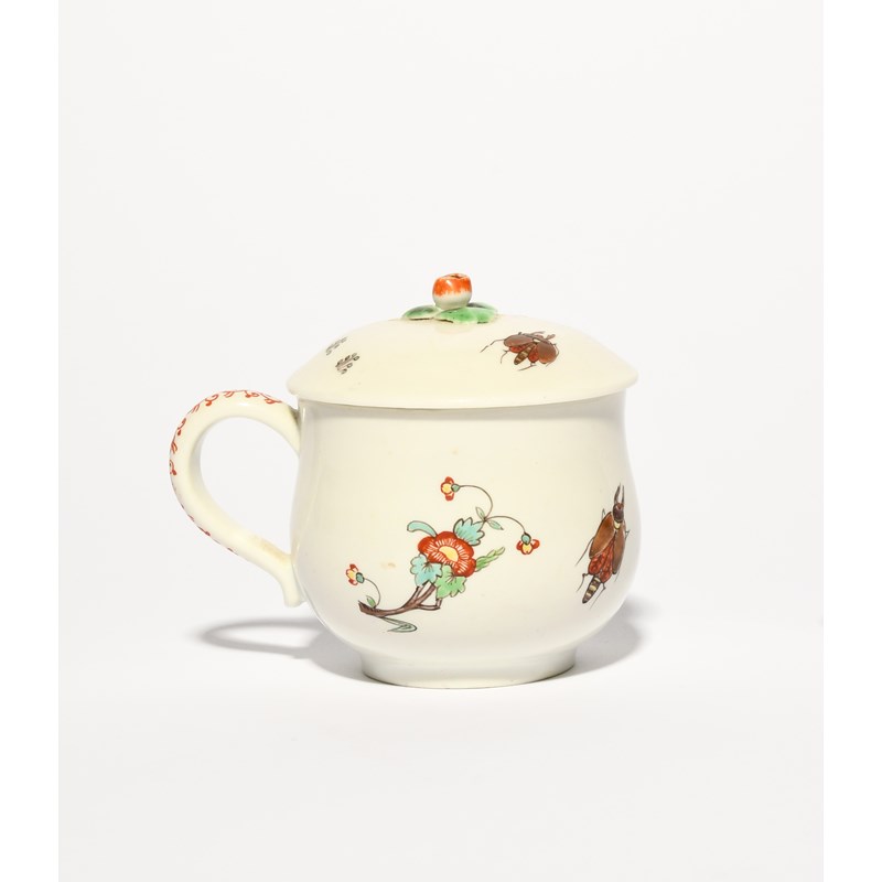 A Chantilly custard cup (pot à jus) and cover, c.1750, the round-bodied form painted in the Kakiemon palette with flowering branches, and with a large bug or beetle, 7.5cm high. (2)