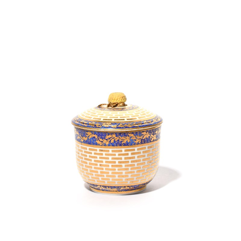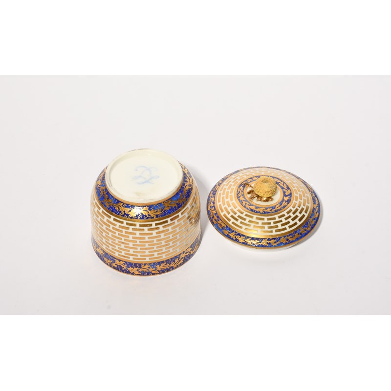 A Sèvres sucrier and cover, c.1770, decorated with a pattern of gold brickwork (briques d'or), the rims with a continuous gilt leaf border on a blue ground, blue interlaced LL mark, 10cm. (2)