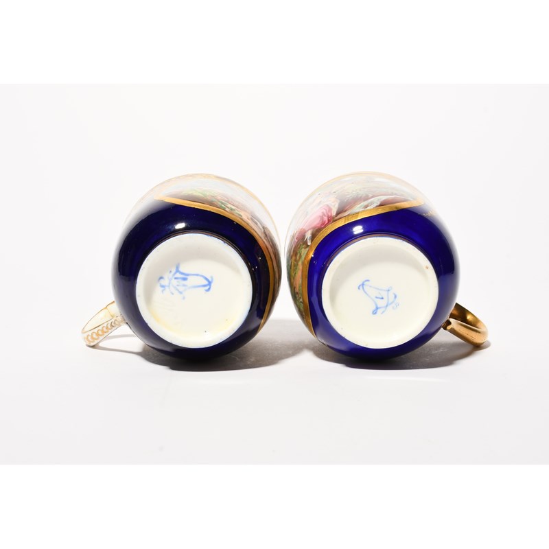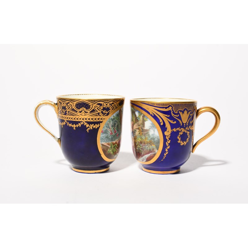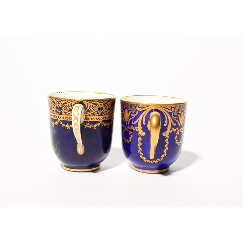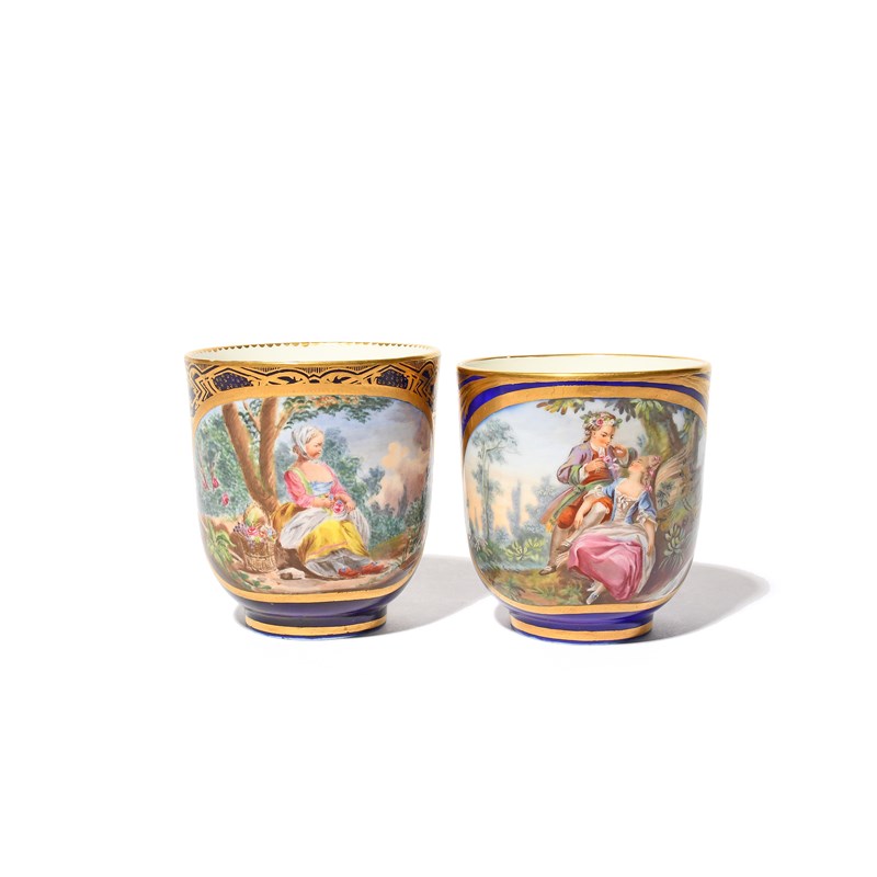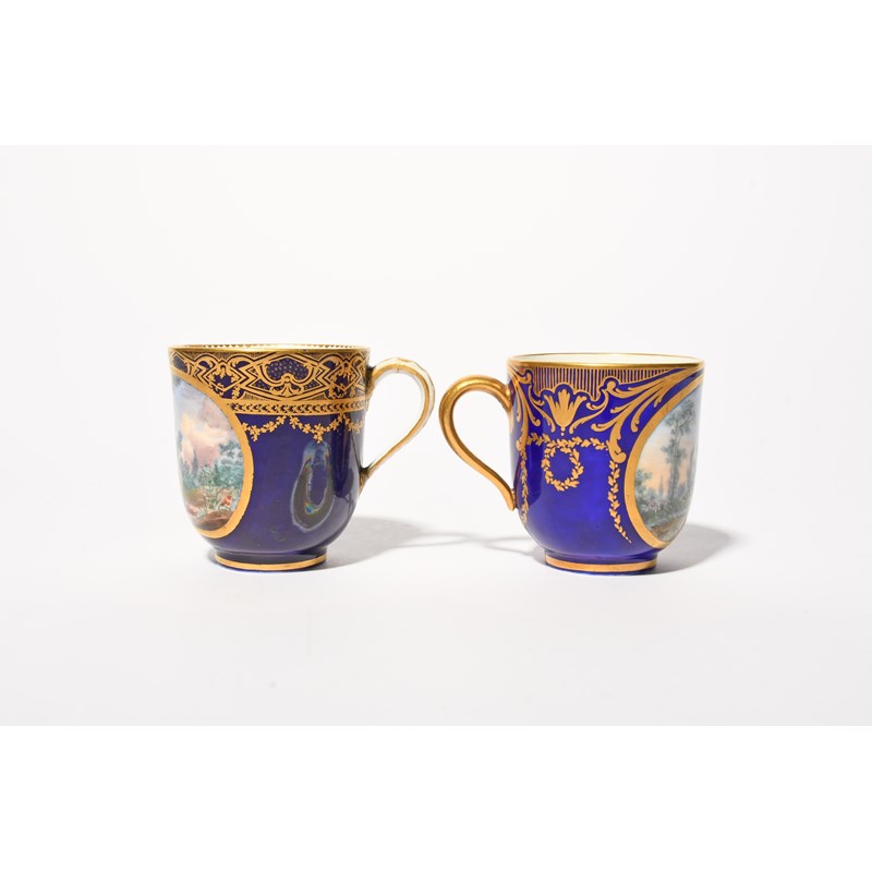 Two Sèvres coffee cups, date codes for 1765 and 1774, painted by Jean-Etienne Chabry with pastoral scenes, one of a couple beside a stream, the other with a girl and a basket of flowers, reserved on blue grounds with elaborate gilt borders, blue interlaced LL marks enclosing date letters M and V above cb painter's marks, one handle broken and restuck, 8cm. (2)