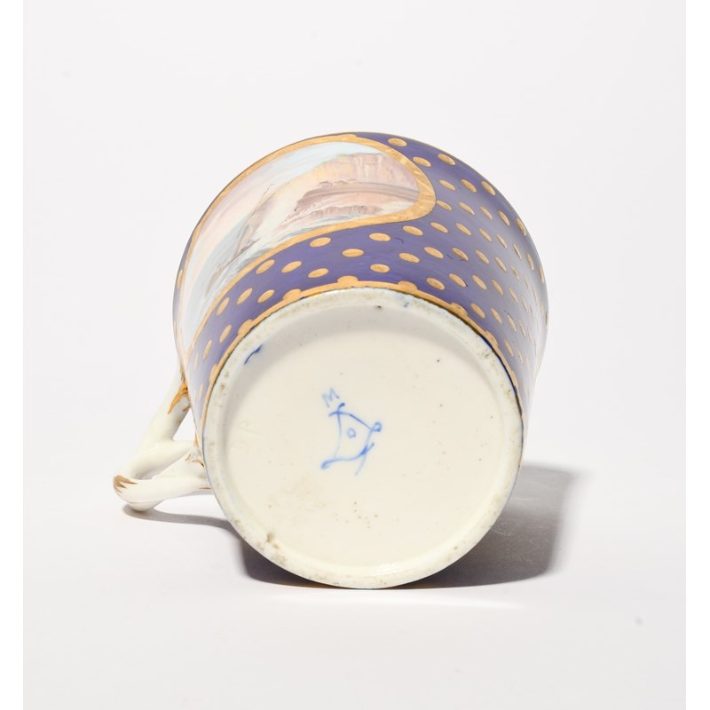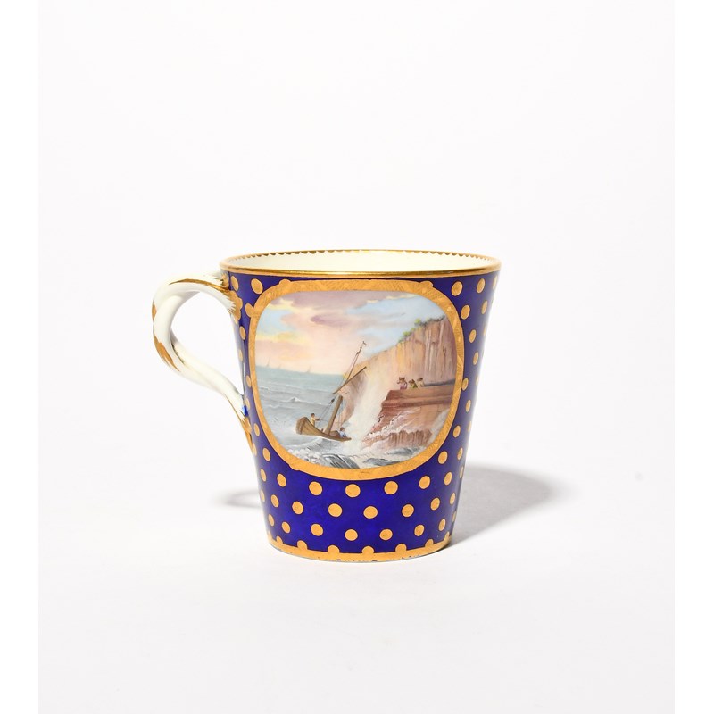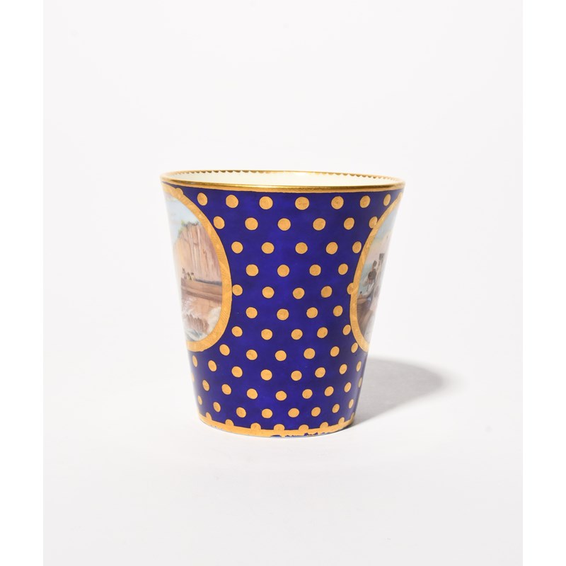 A large Sèvres cup (gobelet de la Reine), date code for 1767, painted probably by Jean-Louis Morin with harbour scenes, to one side traders rolling barrels, the reverse with a ship approaching harbour in a storm, reserved on a bleu nouveau ground with gilt polka dots, interlaced blue LL mark enclosing date letter O, with painter's mark M, 8.7cm.