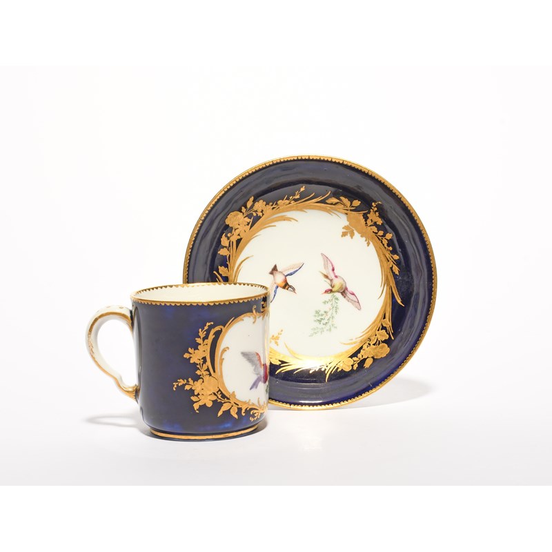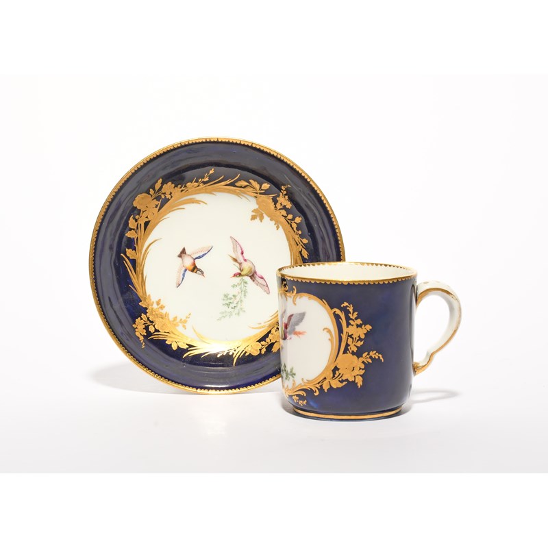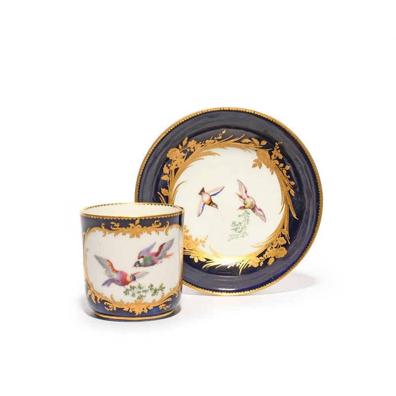 A Vincennes cup and saucer (gobelet calabré et soucoupe), c.1753-54, painted with colourful birds in flight, passing leafy branches between their beaks, within gilt floral and foliate borders on a bleu lapis ground, blue interlaced Ls mark enclosing date letter A to the saucer, 13.3cm. (2)