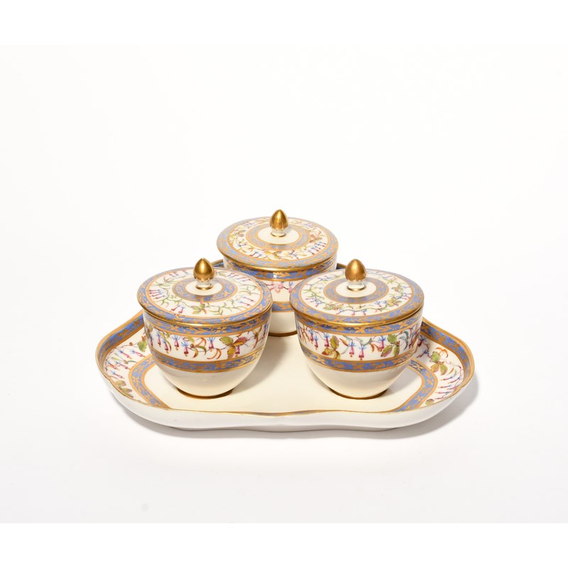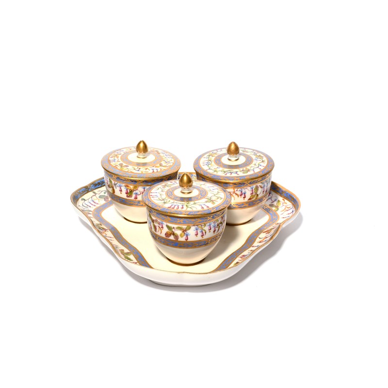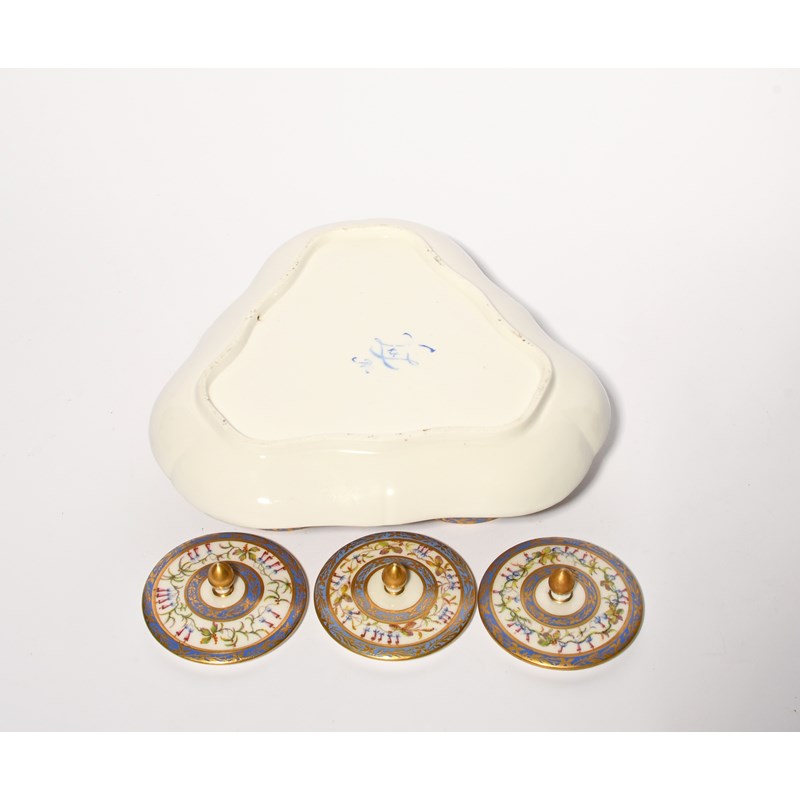 A Sèvres triple jam pot on a fixed triangular stand (plateau à trois pots de confiture), date code for 1787, from the Montmorin service, painted by Massy with a band of fuchsia between pale blue borders enclosing gilt foliate designs, blue interlaced LL mark enclosing date letters KK, painter's mark, one finial restored, 22cm across. (4)