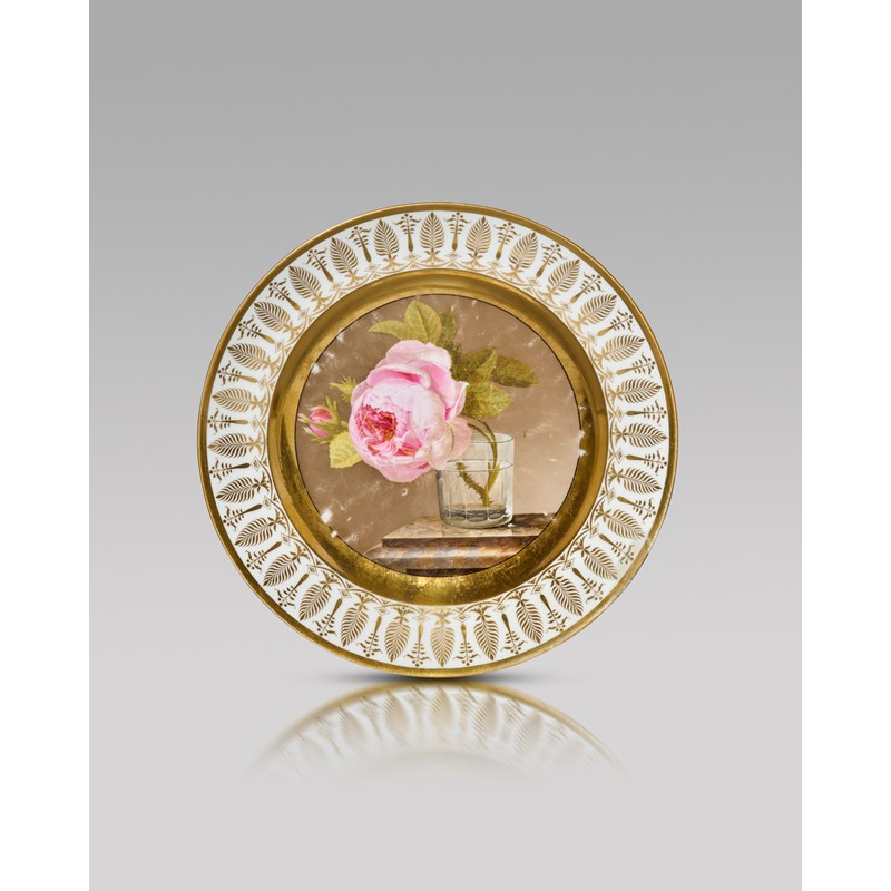 A Dihl et Guerhard (Paris) porcelain plate c.1814, finely painted, probably by Cornelis van Spaendonck*, with a large pink rose in a faceted beaker of water resting on a marble plinth, the rim with a formal design of gilt palmettes, printed red factory mark, a little rubbing, a small repair to the rim, 24cm.