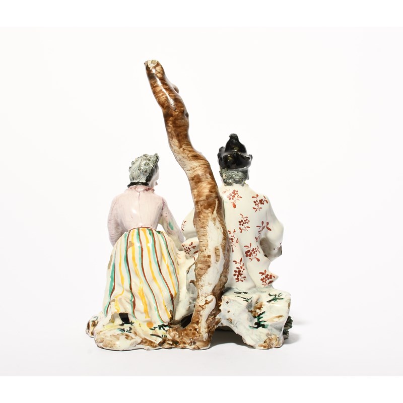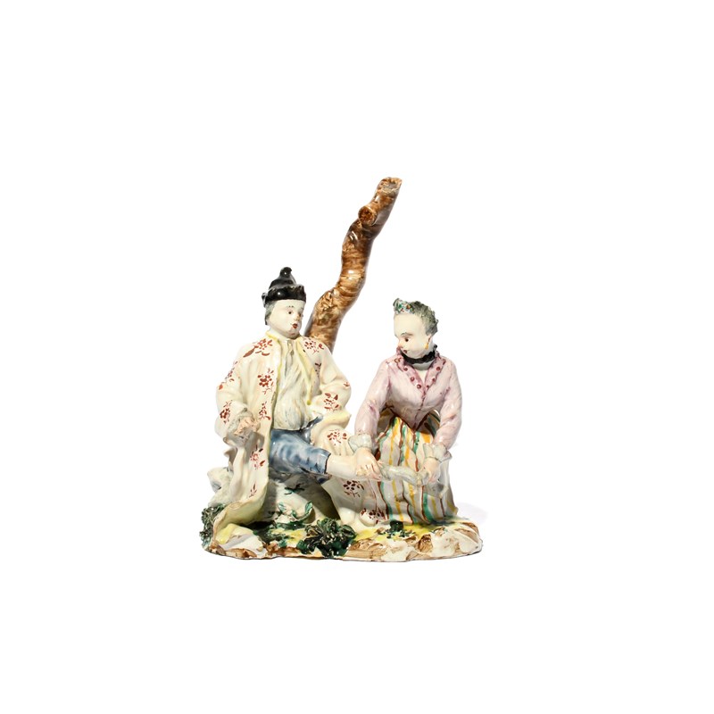 A Savona faïence figure group, c.1770-80, modelled by Giacomo Boselli with a man seated beneath a bare tree trunk while his kneeling companion removes his sock, minor chipping, 19.4cm.