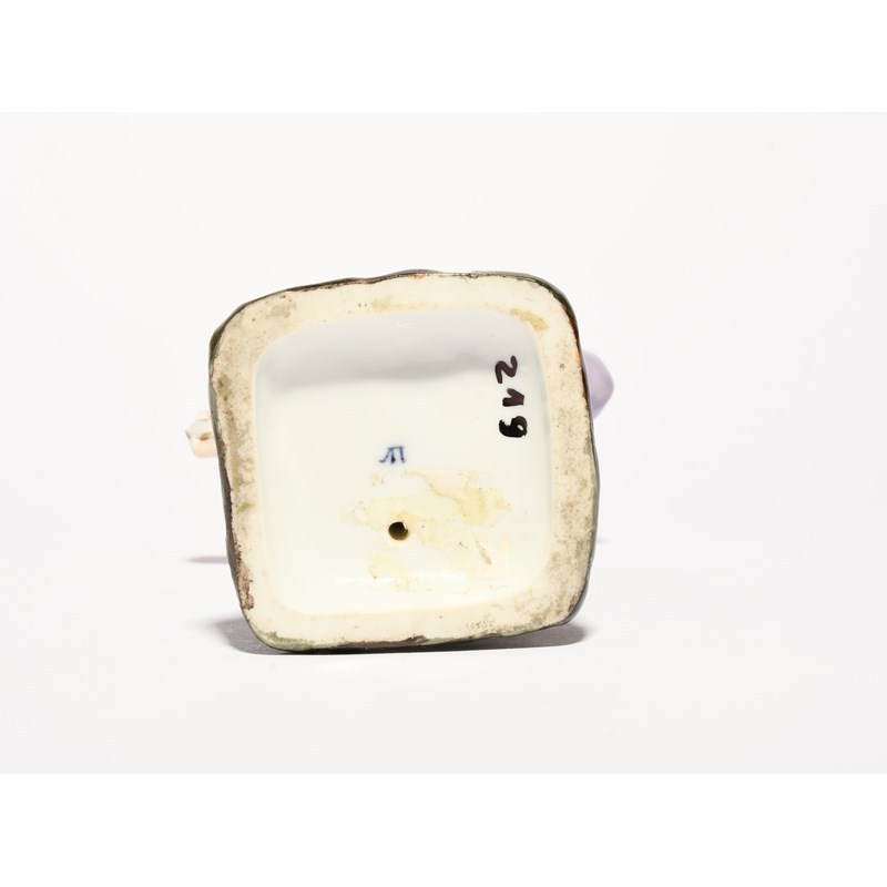 A Russian porcelain figure of an Ottoman archer, Popov Manufactory, 19th century, wearing a long lilac robe tied with a striped sash, carrying a bow in his left hand and an arrow in his right, a quiver on his back, blue monogram mark, his right arm broken and restuck, 17.3cm.