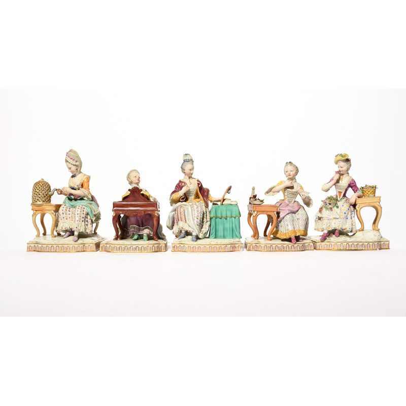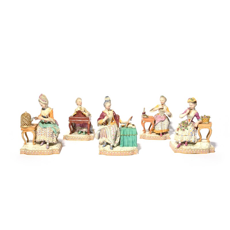 A set of Meissen figures of the Five Senses, late 19th/20th century, modelled by J C Schönheit, each as a young woman seated with varying attributes, Sight gazing into a mirror, Hearing playing the spinet, Smell lifting a flower to her nose, Touch having her finger nipped by a bird in a cage, Taste beside a table set with fruit and pastries, blue crossed swords marks, incised and impressed numbers, 14.5cm high max. (5)