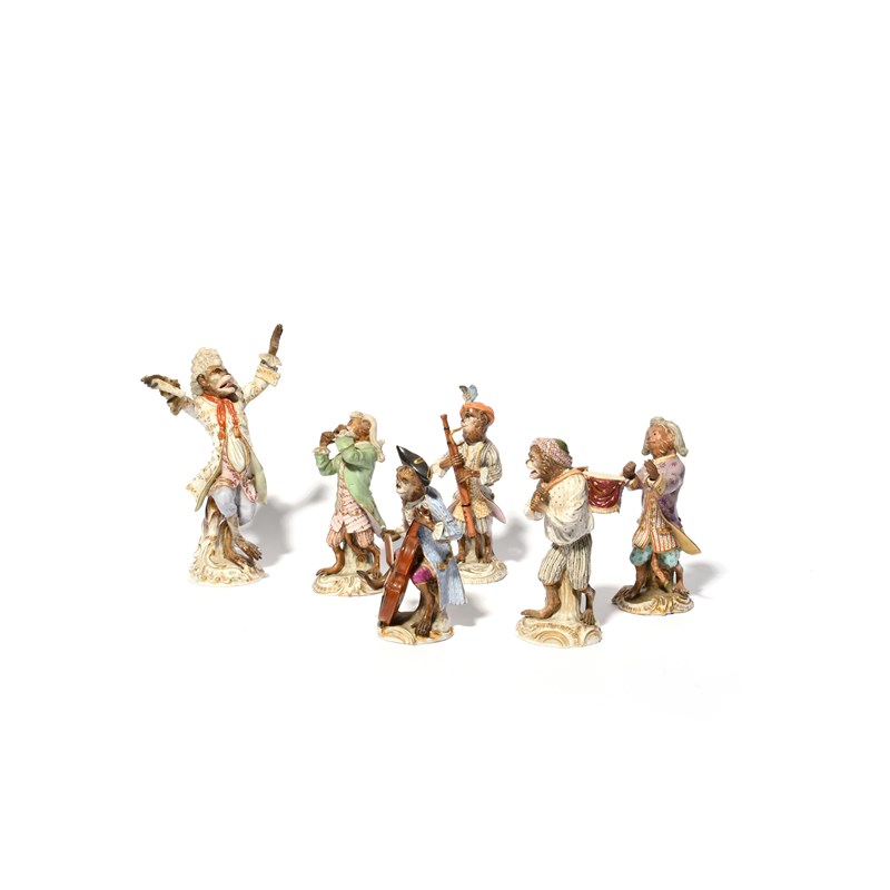 Six associated Meissen figures from a monkey...