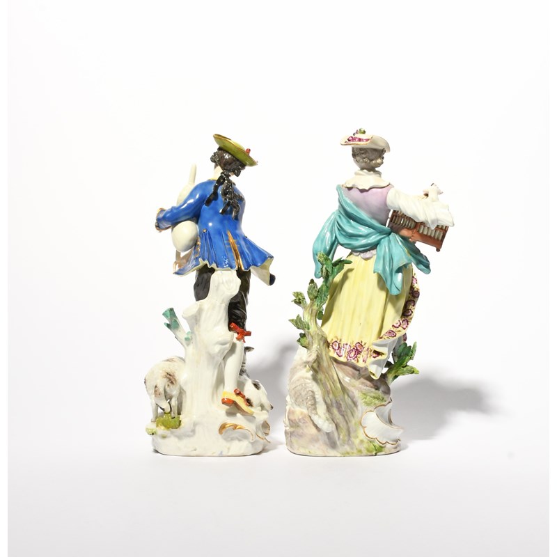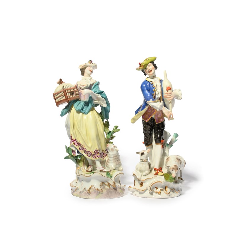 A near pair of Meissen figures of a musical shepherd and his companion, c.1750-60, modelled by J J Kändler, he carrying bagpipes, a dog by his side and a sheep nibbling leaves, his companion carrying a bird cage, standing beside a recumbent sheep, each raised on a scroll base with gilt detailing, blue crossed swords marks, small restorations, 26cm. (2)