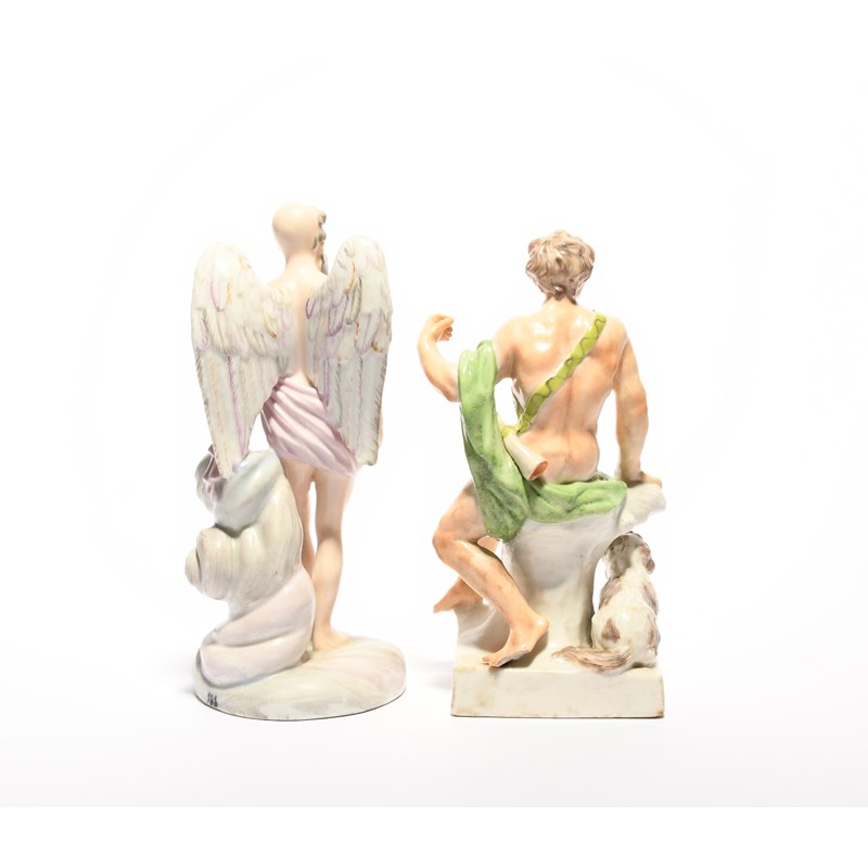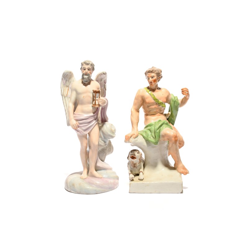 A Kloster Veilsdorf figure of Mars or Apollo, c.1765-70, modelled by Friedrich Eugen Döll and Wenzel Neu, seated on a low tree stump with a hunting horn slung over one shoulder and a dog by his side, and another figure of Father Time, probably also Kloster Veilsdorf, standing before cloud scrolls and holding an hourglass, small losses, 18.2cm max. (2)