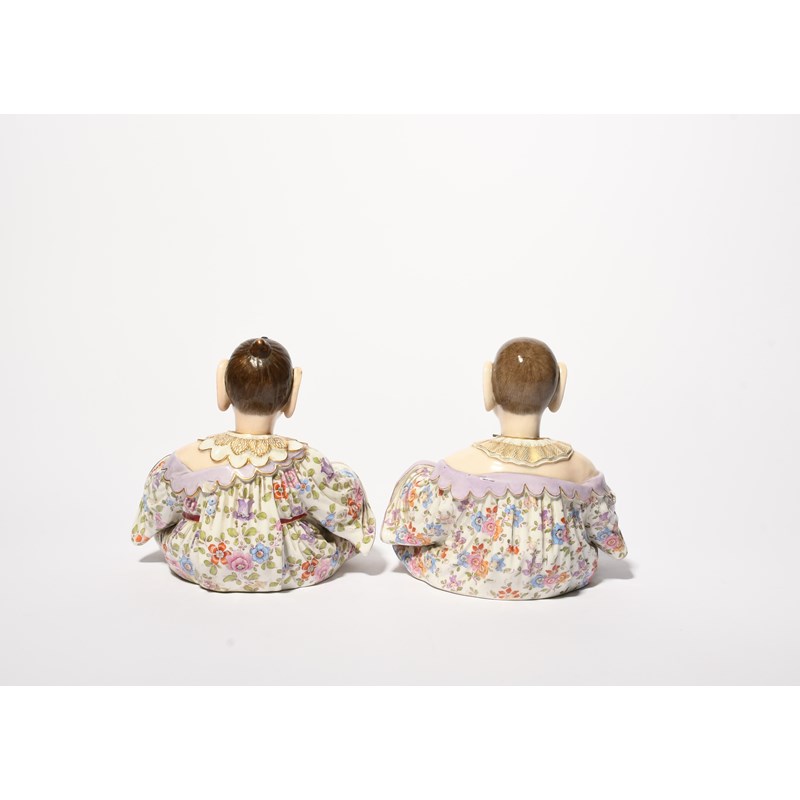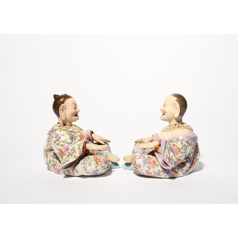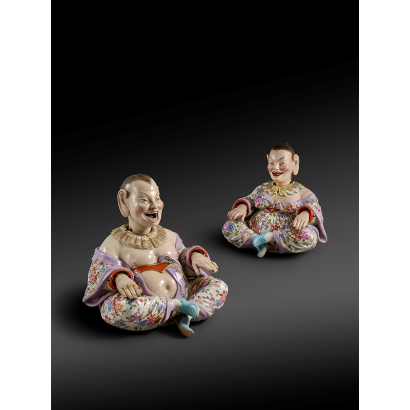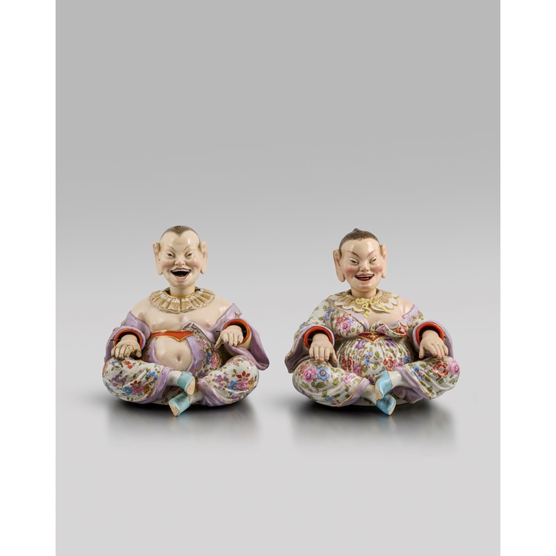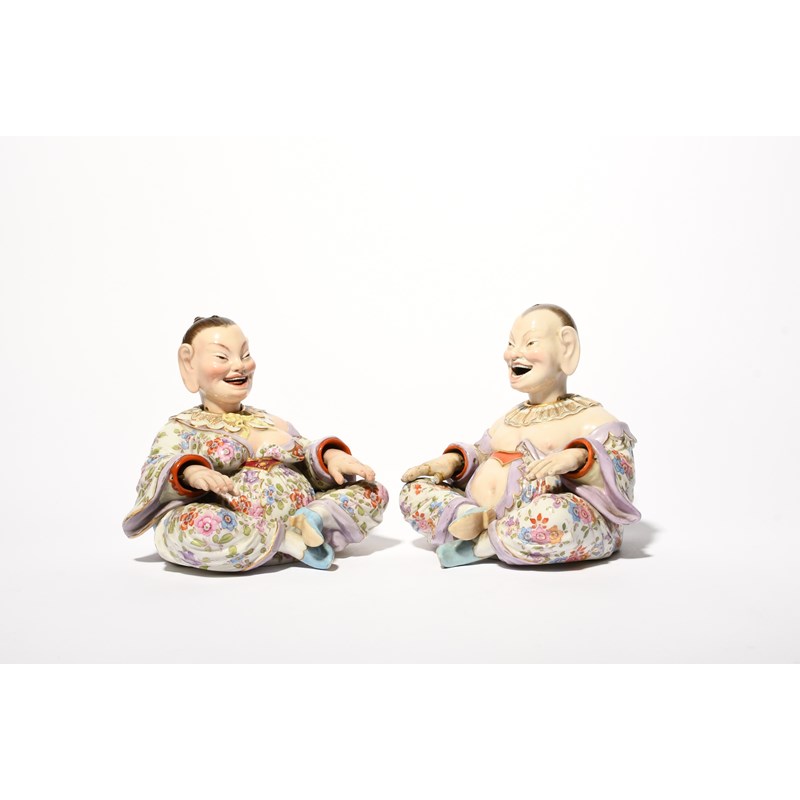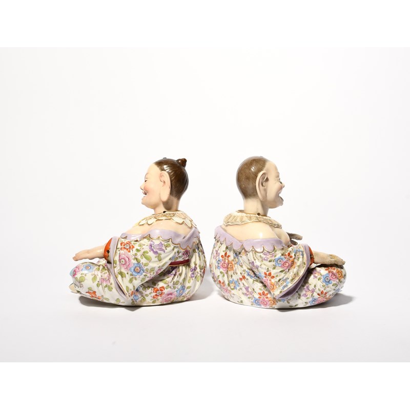 A pair of Meissen pagoda figures, late 19th/20th century, modelled as a Chinaman and his female companion, each sitting cross-legged with expansive bellies, wearing robes painted with indianische Blumen, with nodding heads, protruding tongues and waving hands, blue crossed swords marks, incised 156 and 157, impressed 92, damage to one hand, the woman's topknot restored, 18.3cm. (2)