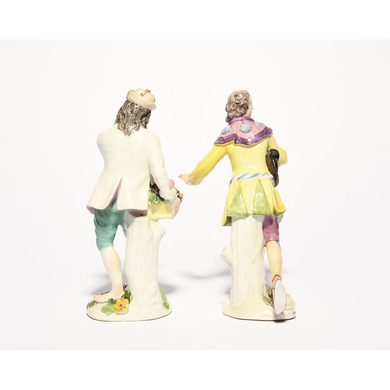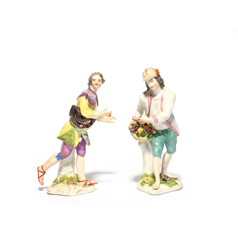 A Meissen figure of a pilgrim, mid 18th century, modelled by Peter Reinicke in a dynamic pose, wearing a caplet with scallop shell motifs over a yellow jacket, and a Meissen figure of a gardener standing barefoot beside a basket of fruit, restorations, 18cm max. (2)