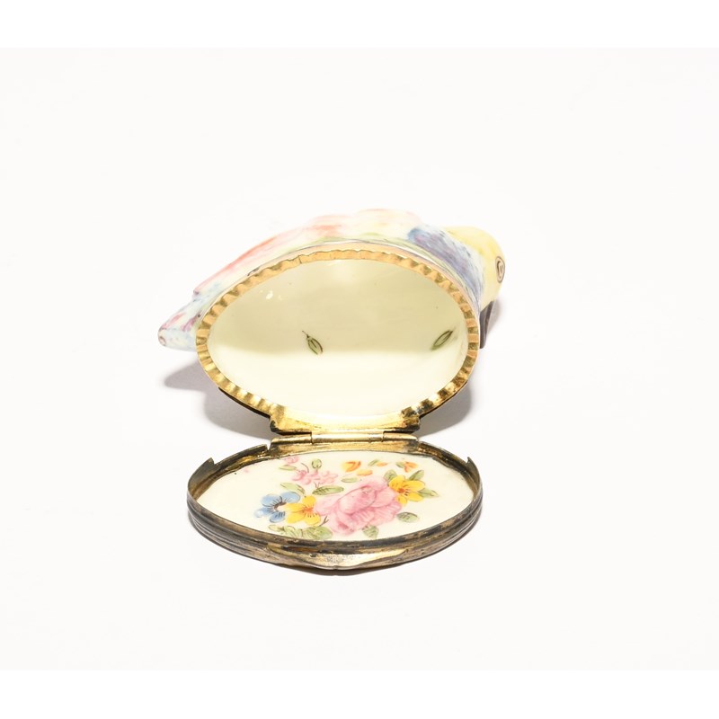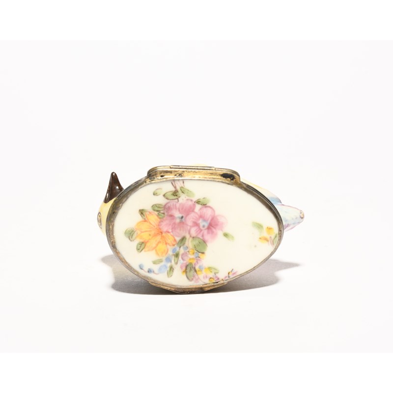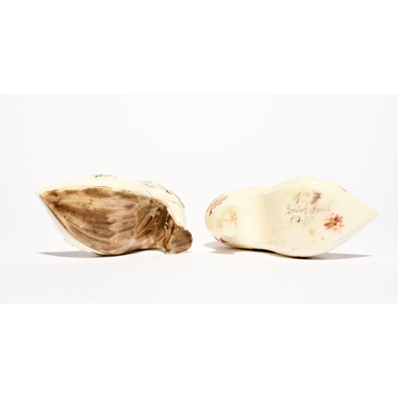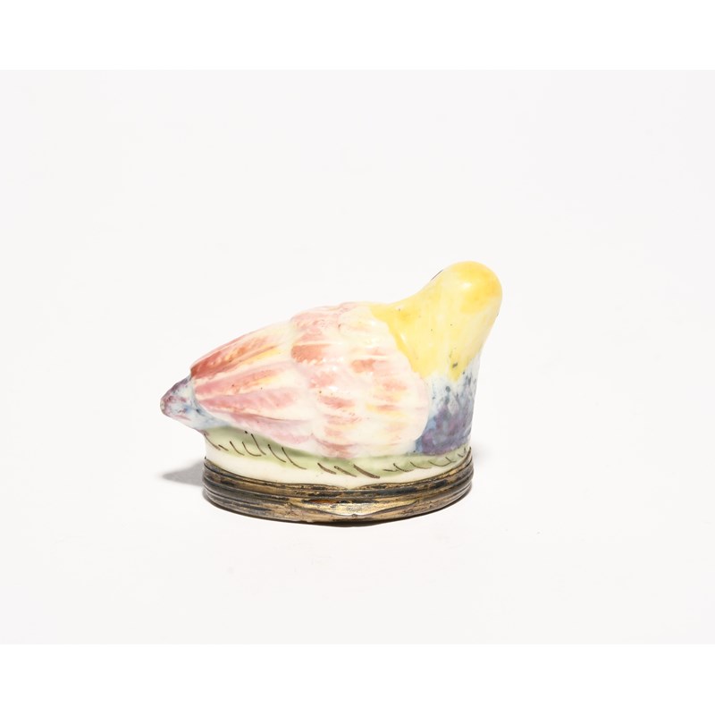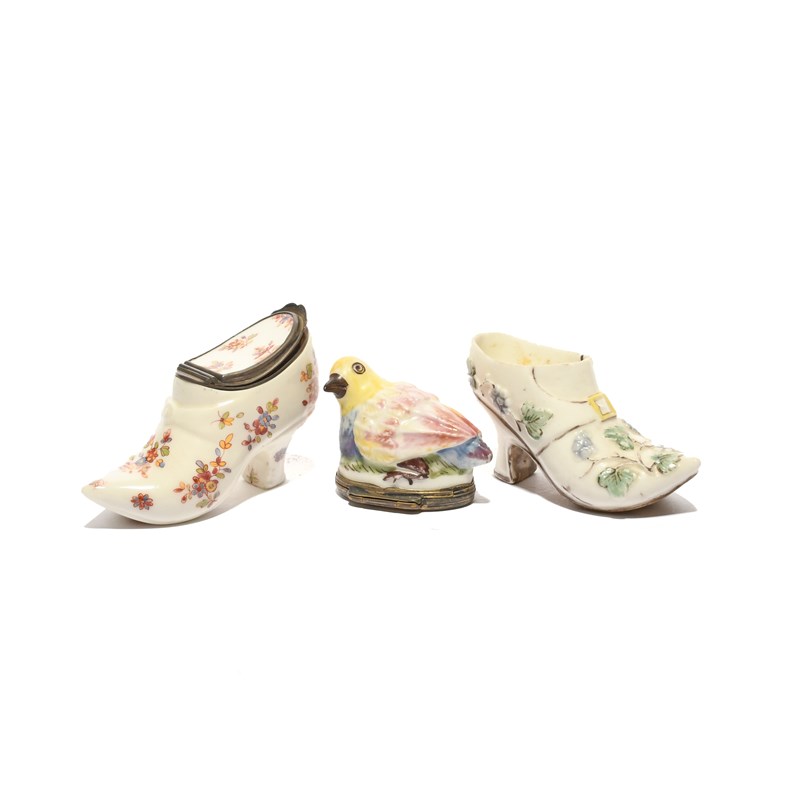 Three French porcelain bonbonnieres, c.1740, two St Cloud and modelled as buckled heeled shoes, one painted with small flower sprays in Kakiemon enamels, the other applied with grapevine, and last Mennecy and modelled as a bird with head turned to the left, with an egg-shaped silver-mounted lid, one shoe missing its lid, 8.3cm max. (3)