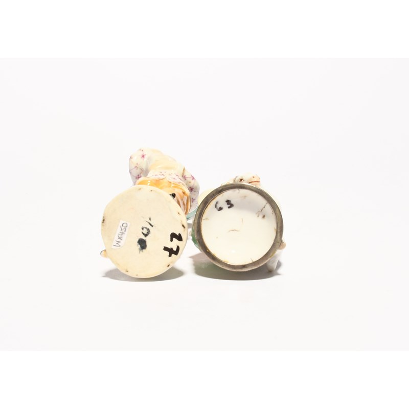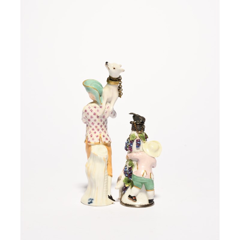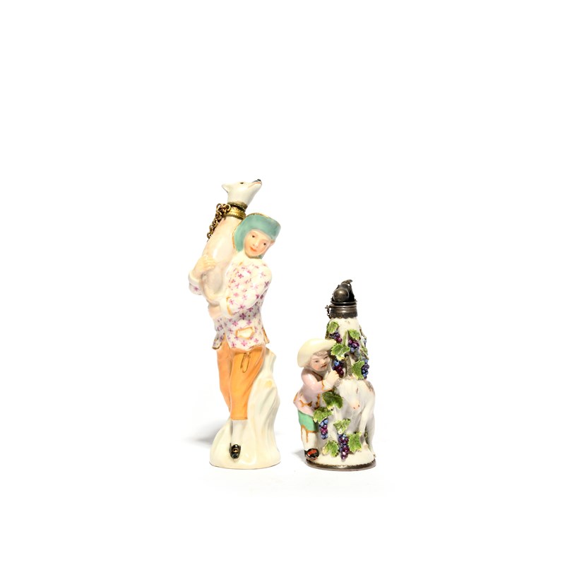 Two German porcelain scent bottles, c.1760-80, one possibly Tettau and modelled as Scaramouche from the Commedia dell'Arte carrying a dog whose head forms the metal-mounted stopper, blue T or F mark to the reverse, the second possibly Kloster Veilsdorf and formed as a boy with a goat around a column applied with fruiting vine, the metal stopper formed as a pear, 10.5cm max. (2)