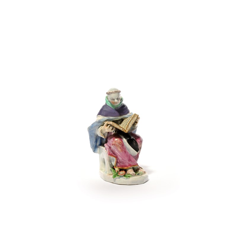 A Bow figure of a seated monk, c.1758-60, reading from a large book or Bible, the low pad base applied with flowers and leaves, some restoration to his robe and hands, 11.7cm.