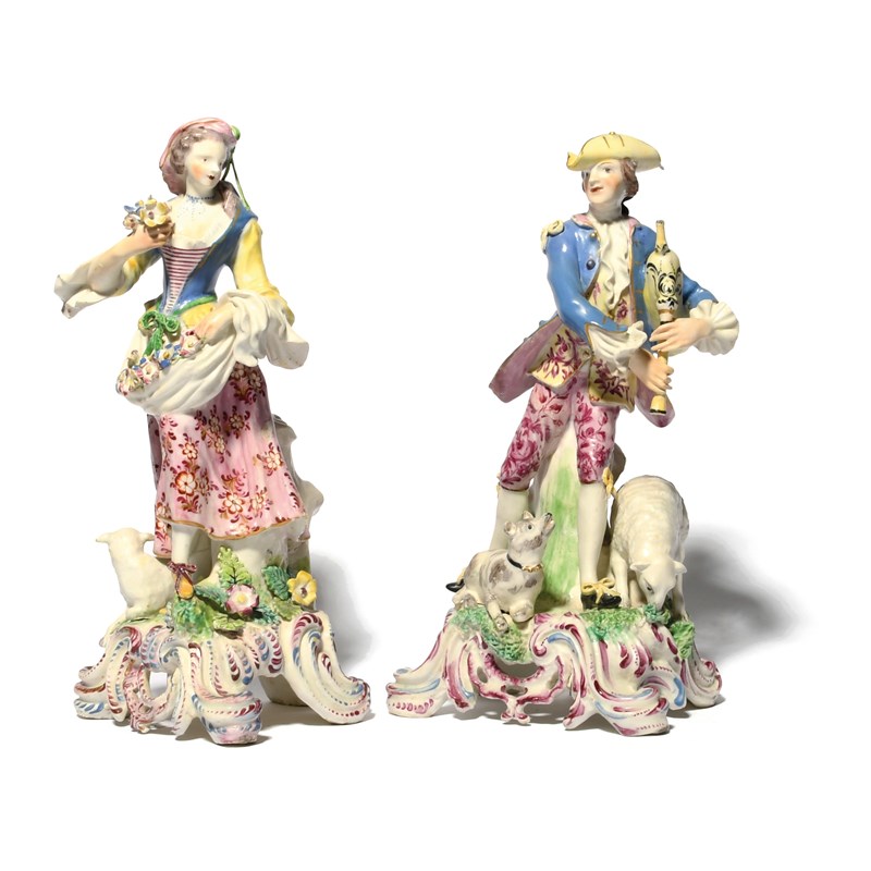 A large pair of Bow figures of a piper and his companion, c.1762-65, he standing with a dog and a sheep by his feet, she with an apron full of flowers and a lamb recumbent beside her, each brightly enamelled and raised on a tall scrolled base highlighted in blue, puce and gilt, some restoration, 27.2cm. (2)