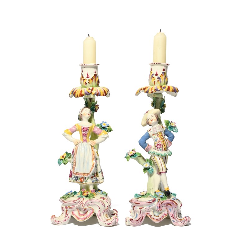 A rare matched pair of Bow candlestick figures of the Dutch Dancers, c.1765-70, he standing with his hands behind his back and right leg extended, she with her hands on her hips, each on a footed base before a flowering tree stump supporting a scrolled and colourful candle sconce, 26cm. (2)