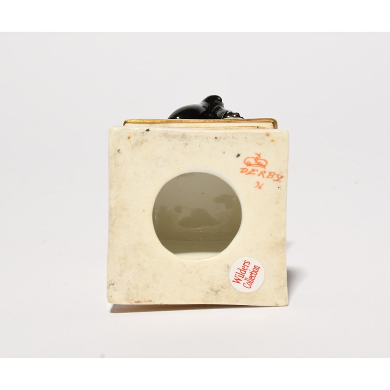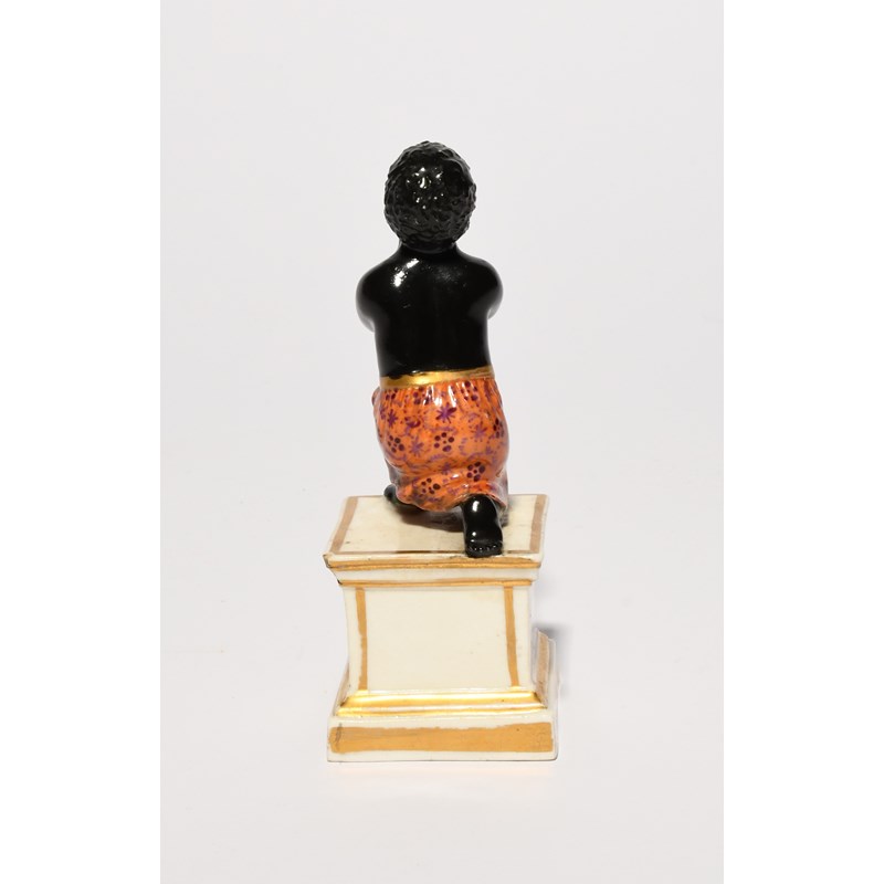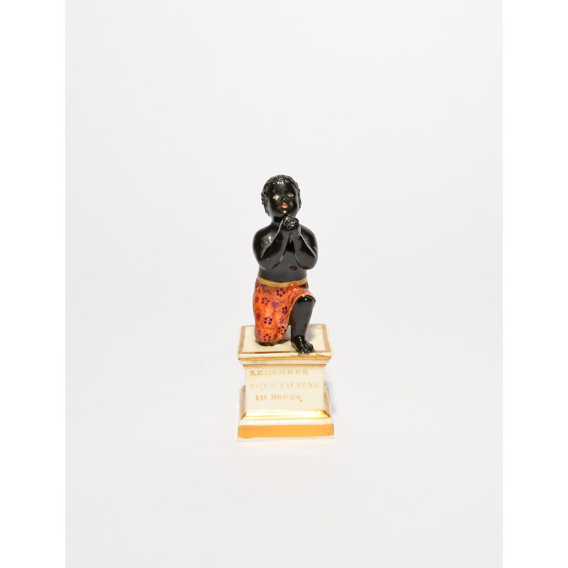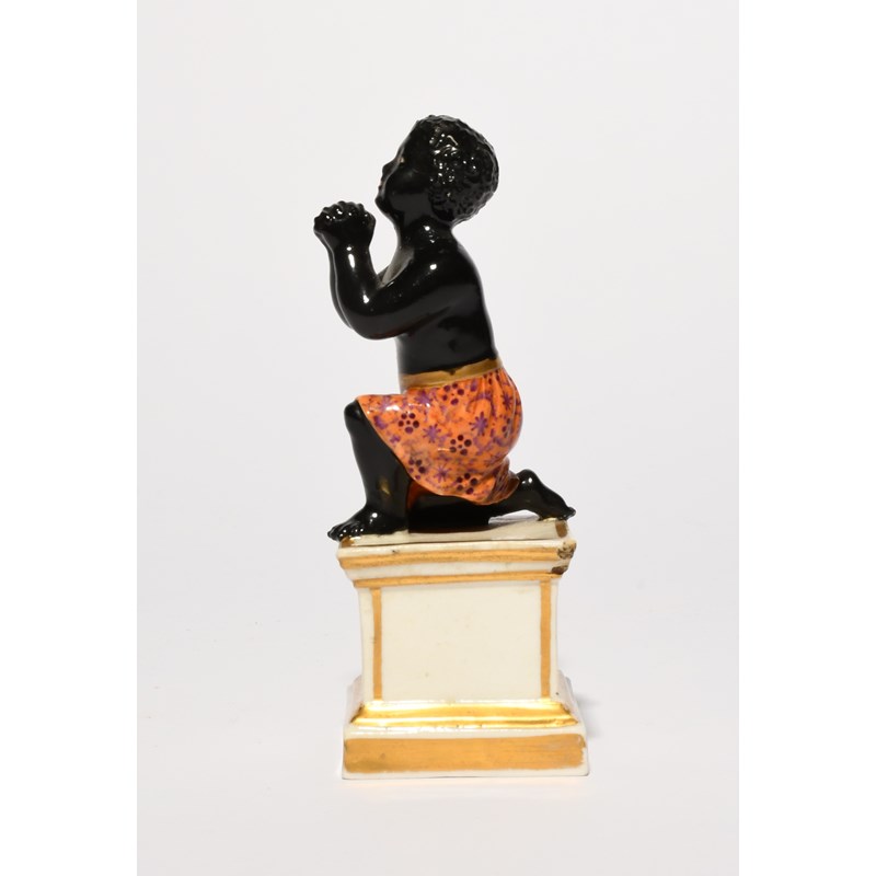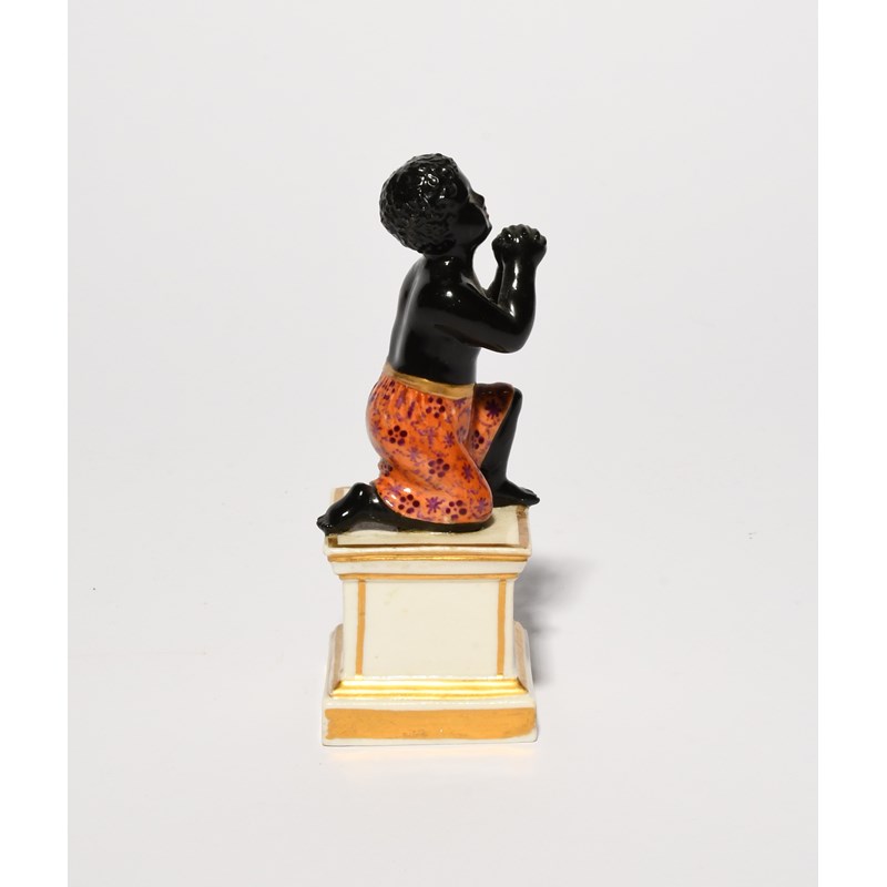 A rare Derby anti-slavery figure, early 19th century, modelled as a young black slave on one knee with hands clasped, raised on a square base inscribed in gilt with Hebrews 13:3 'Remember them that are in bonds', iron red crowned Derby mark, some good restoration, 10.3cm.