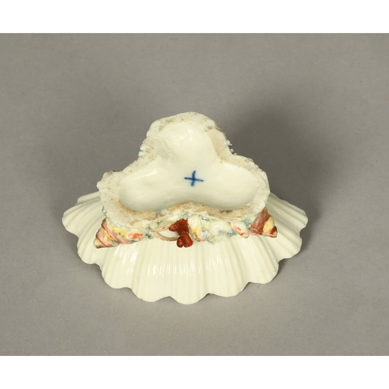 A Bristol shell salt or sweetmeat dish, c.1768-72, formed as a scallop shell painted with a central flower spray, the rim with a scroll and husk border in red and blue, raised on a low base applied with shells, coral and seaweed, blue X mark, 10.5cm across.