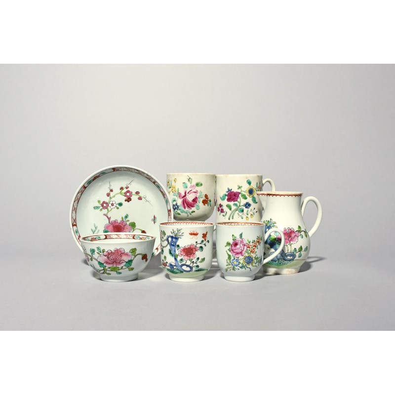 A small group of Liverpool teawares, c.1760-65, including a teabowl and saucer, three coffee cups, a coffee can and a milk jug, variously decorated with sprays of flowering peony, two cups with sprays of European flowers, the can with a bird in flight beside flowers, 12.4cm max. (7)