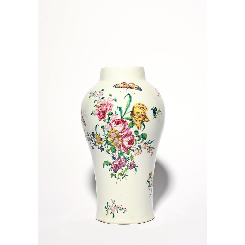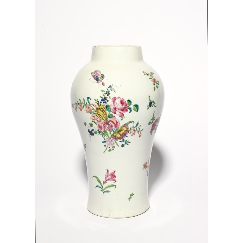 A large Richard Chaffers (Liverpool) vase, c.1756-58, the baluster form well-painted with butterflies and moths around arrangements of flowers and smaller scattered sprays, the cover lacking, 30.5cm.