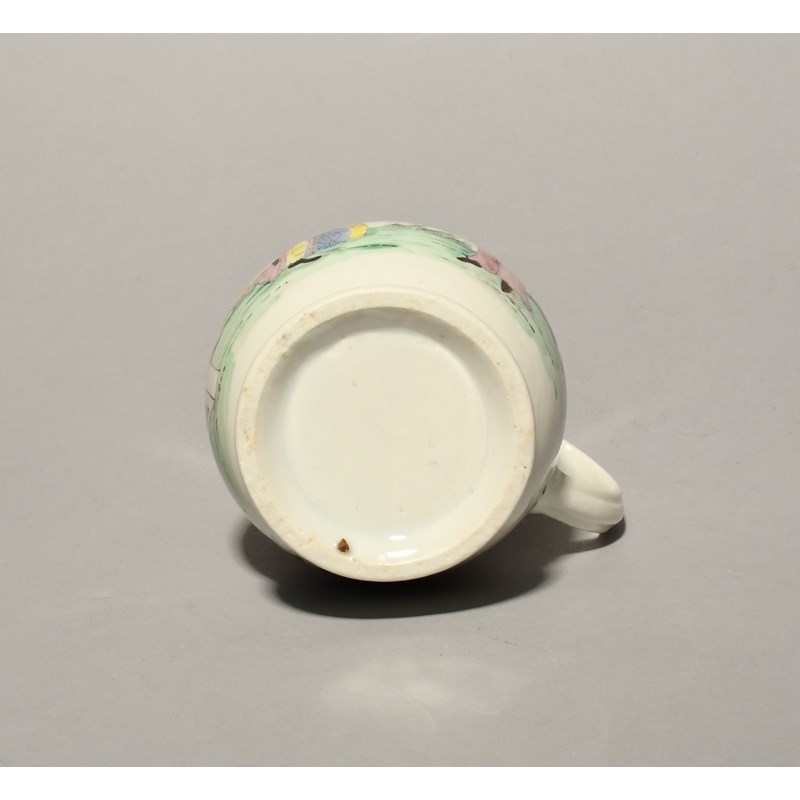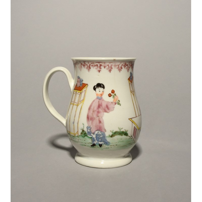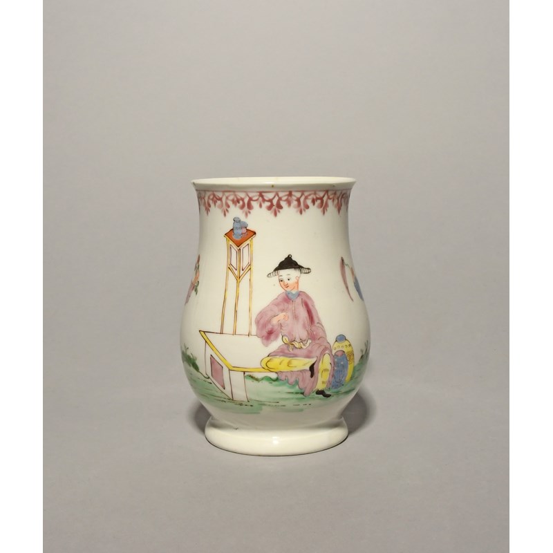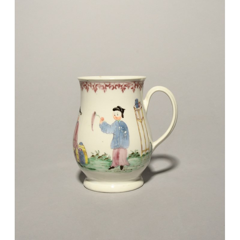 A Plymouth mug, c.1769-70, the bell shape painted in polychrome enamels with a Chinese man seated at a low table between two ladies holding flower sprays and a long feather, with tall tea stands beside, the rim with a formal foliate design in puce, a section of the rim broken and restuck, a further short crack, 12.5cm.