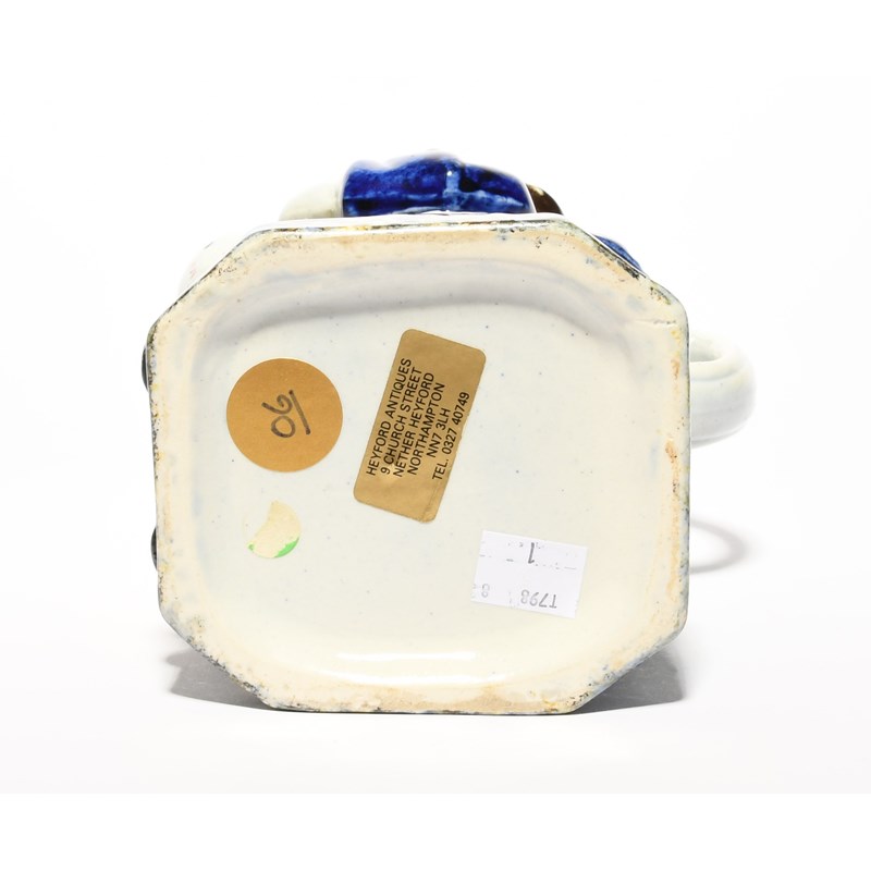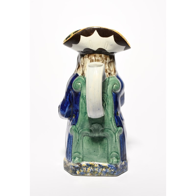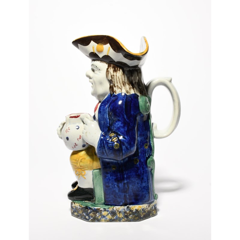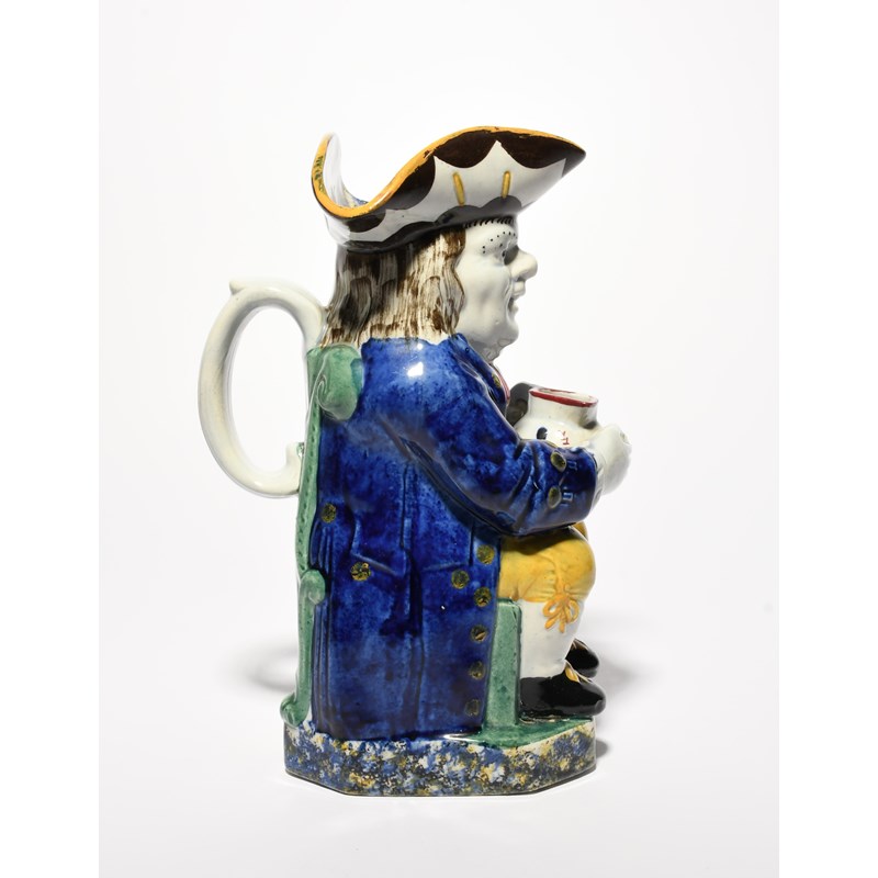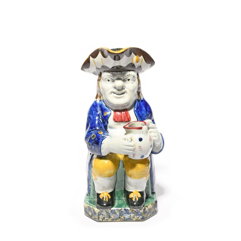 A Mexborough (Yorkshire) Toby jug, c.1820, seated with a patterned jug of ale, wearing a deep blue coat over yellow breeches, sponged in blue, yellow and black to the hat interior and base, 23.7cm.