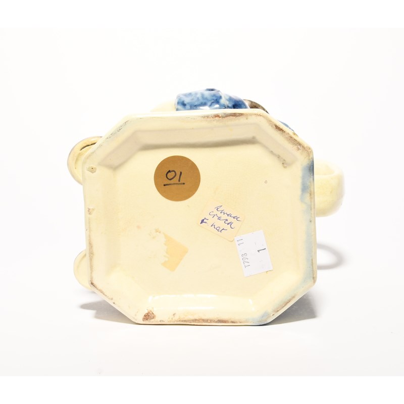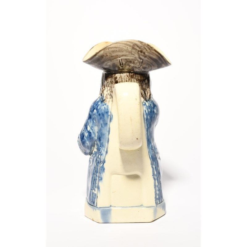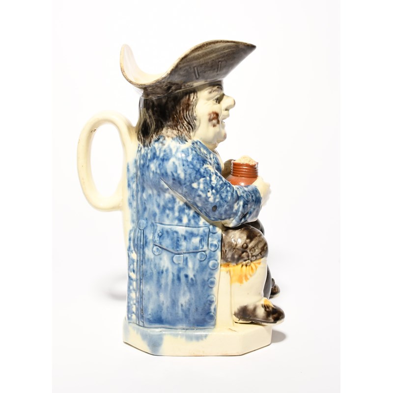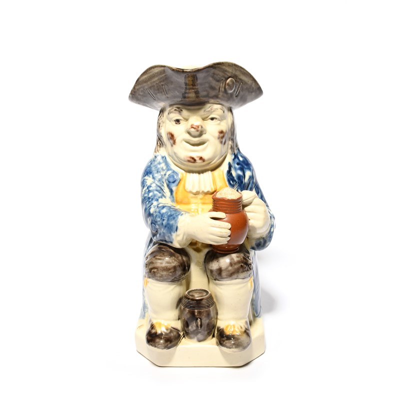 A Wood type Toby jug, c.1790-1800, seated with an upright barrel between his feet, a foaming jug of ale resting on one knee, wearing a sponged blue coat over black breeches and an ochre waistcoat, his hat sponged in grey, some restoration to his hat, 25.8cm.