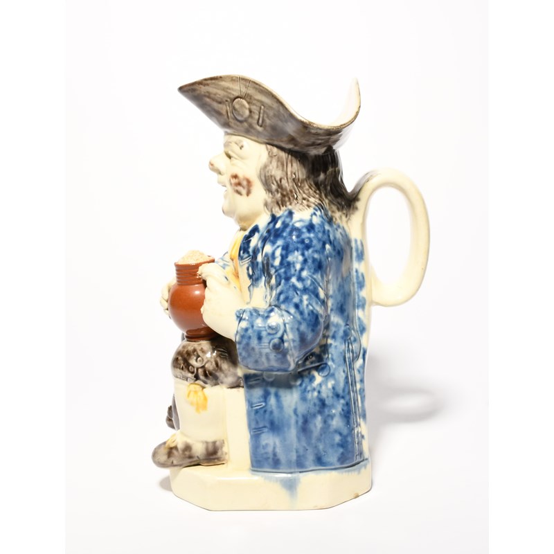 A Wood type Toby jug, c.1790-1800, seated with an upright barrel between his feet, a foaming jug of