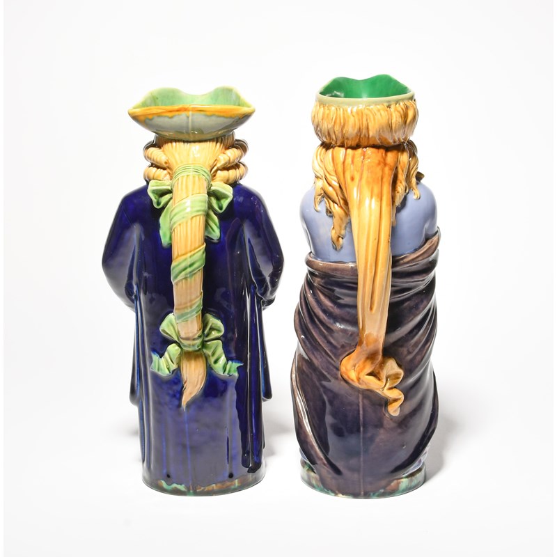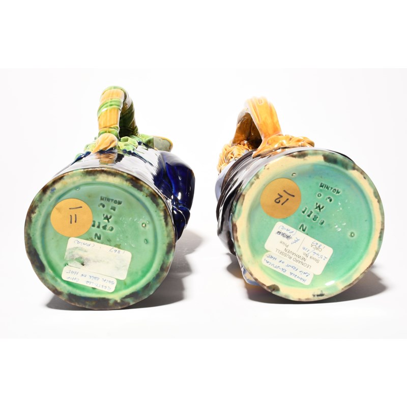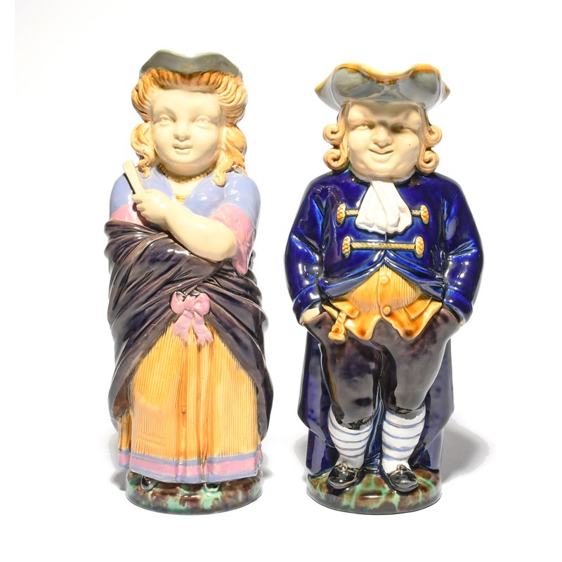 A pair of Minton Majolica Toby jugs, date codes for 1867, modelled as a Quaker and his companion,