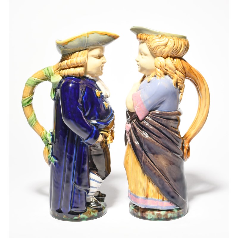 A pair of Minton Majolica Toby jugs, date codes for 1867, modelled as a Quaker and his companion, he standing with his hands in his pockets, she holding a fan and clutching her shawl around her, their hair forming the handles behind, impressed marks, 28cm max. (2)