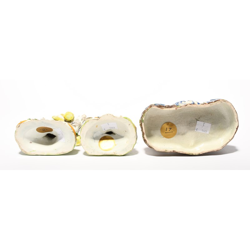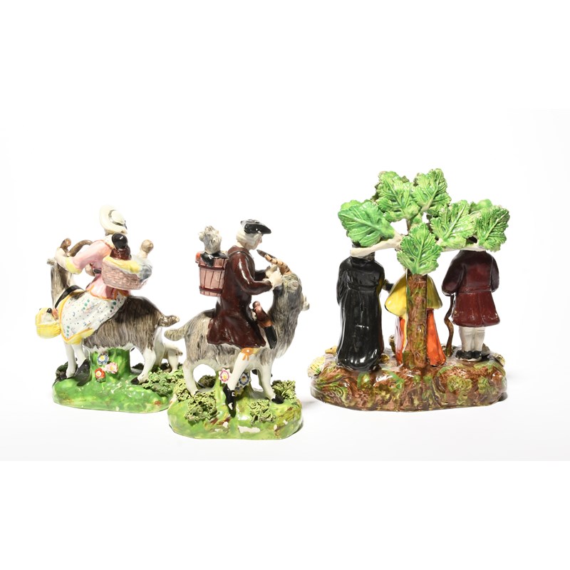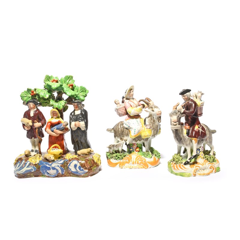 A pair of Staffordshire pearlware figures of the Welsh Tailor and his wife, c.1815, riding goats, raised on scrolled bases with ochre detailing, and a Staffordshire Tithe Pig group, some restoration, 15.7cm max. (3)