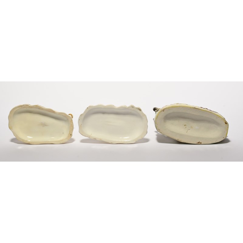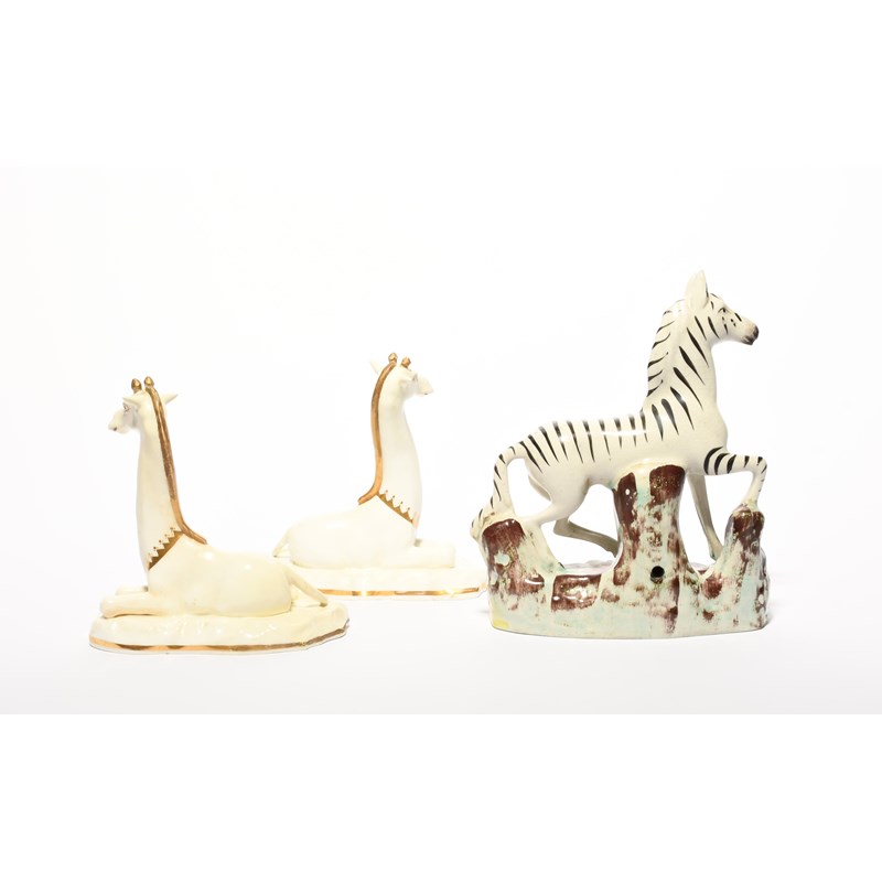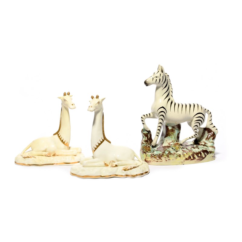 A pair of Grainger Lee (Worcester) figures of giraffes, c.1828, recumbent on rocky bases with heads erect, left in the white with gilt detailing, together with a Staffordshire pottery zebra raised on a rocky base with mossy applications, some restoration, 15.5cm max. (3)