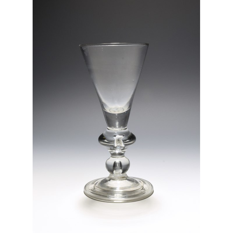 A heavy baluster wine glass or goblet, c.1710, the drawn trumpet bowl with a solid base, the stem