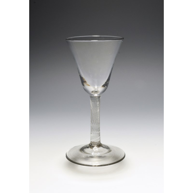 An incised twist wine glass, c.1750-60, the round funnel bowl raised on an incised twist stem over a conical foot, 14.8cm.